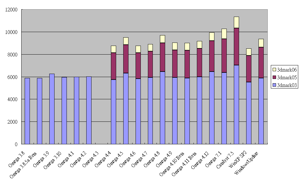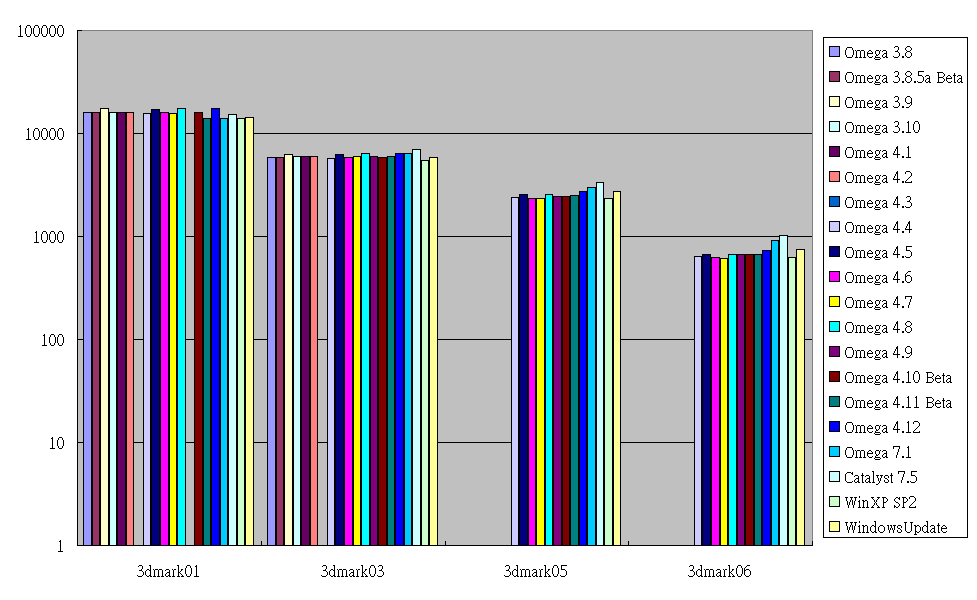 4個月前的測試...請賞圖 Omega 4.3 有問題, 不能正常開機測試 Omega 4.4及之前的因為有功能不支援, 故沒測 3DMark05及06 Omega 4.9 不能成功跑完3DMark01 (Game 3 Low detail - not supported by hardware) Omega/Catalyst 5系,6系,7.2~7.4 因為時間問題直接跳過 ![]() 3DMark01 成績 Best: Omega4.12 - 17558 Worst: Omega4.11beta - 14094 P.S. Catalyst 8.252 = Catalyst 6.5 ![]() ![]() |