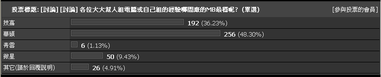 我沒說哪家用的人多 因為我也不知道 不過可以確定的是 這種投票沒有把總使用人數(市佔率)考慮進去 所以有盲點 我只是用A.B代替2個廠商 不要看到A就覺得我是在說ASUS啦 ![]() |