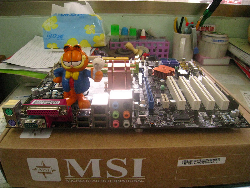 卻也逐漸在大夥的記憶中被淡忘 , 而今 ... ... ... 牠 !! 說著 : I will be back !! (外國貓嘛 ` )重拾信心、力圖振作的加菲 , 決心要走出他人的陰影之下 !! 喏 !! 活出自我 ~ 來看看加菲這回帶來了什麼好康的 -> 您沒看錯 !! 在這個樸實低調的外盒內 , 正放著大夥討論已久的Intel P45晶片 , 此對應MB是 : MSI P45 Neo3-FR !! 可以確定的是不單在歐盟等地 , 現在微星科技也試著將綠色環保概念導入台灣 , 以求更進一步的落實與響應。 正面秀著CLASSIC SERIES標誌 -> 背面右上角貼著MSI的綠色環保標誌 -> 背面右下角可以看出採用的是環保回收材質 -> 除了綠色環保之外 , 節能的要角 : DrMOS 現階段會先以高階版本 (Diamond、Platinum之類) 為優先採用 , 故不在這次的介紹範圍 , 未來各系列版本是否會同時導入這兩種理念 , 就要看市場的接受度了。 配件一覽 -> 主角豋場囉 !! (眾毆飛 ~ )嗚 ~ 饅頭絕對沒有呼嚨各位 , 這張真的是P45的對應MB啦 , 只是外觀看起來像其他型號 , 後面會改用熱導管 !! |