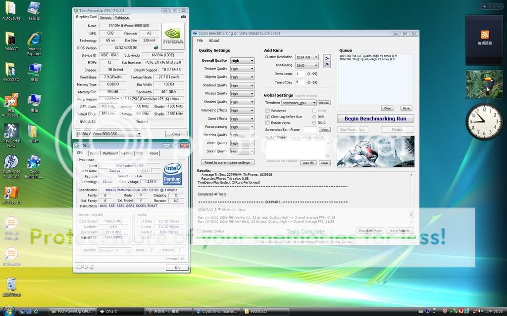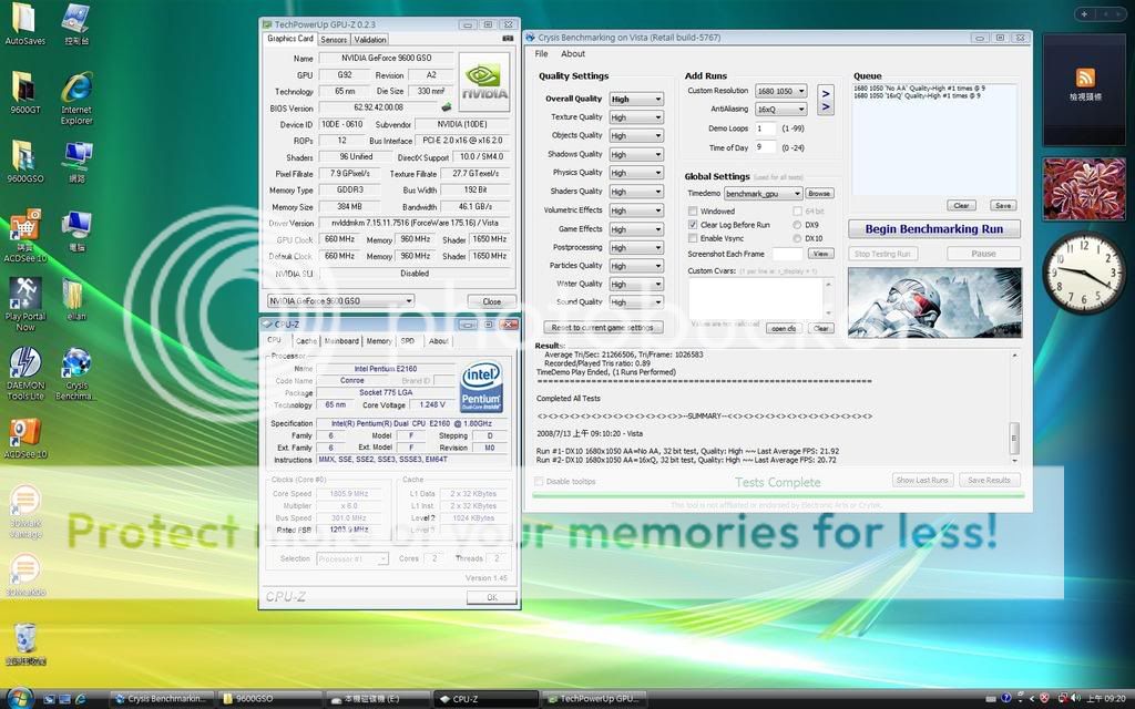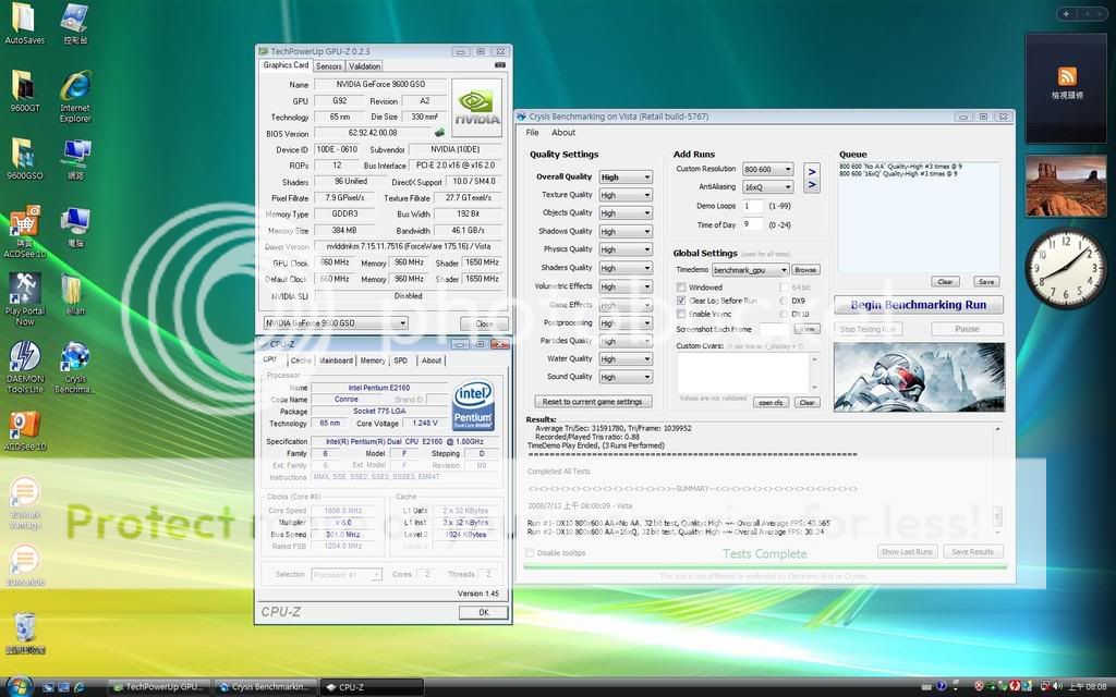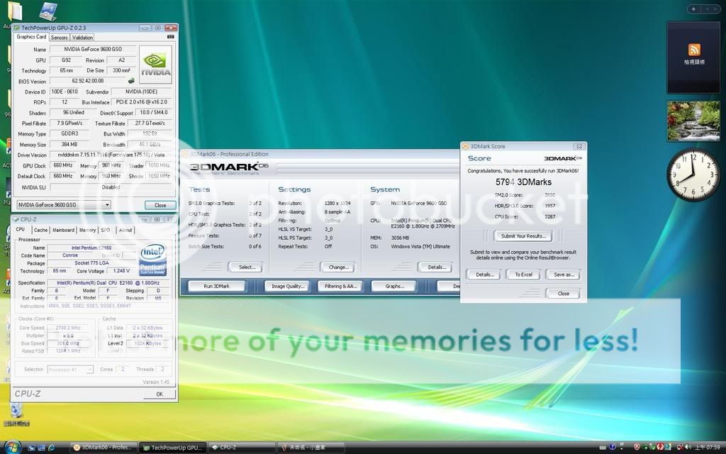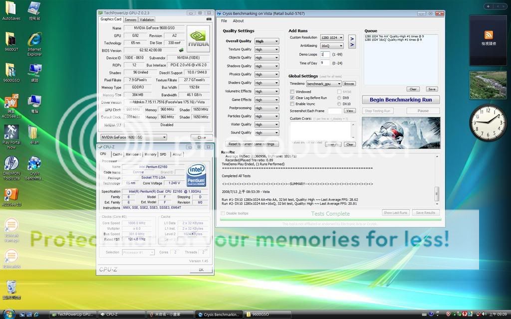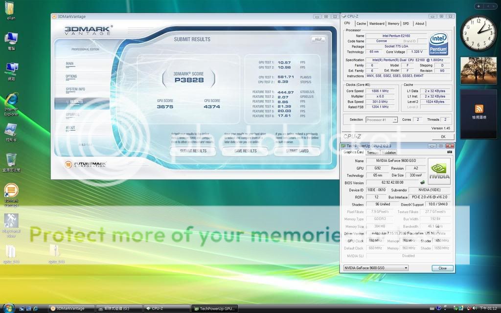 雖然現在大家首推的顯示卡是ATI RADEON HD4850,不過對於窮苦的我來說,6K還是多了一些 不過還是壓抑不住自己的敗家情緒,反正暑假啊,時間多的是(謎之音:明明就自己敗家),在光華 逛了許久,本來想入手GeForce 9600GT,卻在一家小店發現了一張相當超值的顯卡—承啟的9600GSO。 雖然做過功課,知道9600GSO是8800GS的換名版,不過看到其散熱器的設計,就忍不住把它帶回家了 以下就是小弟寫的小小開箱文,請各位大大參考 彩盒的外觀,說真的體積並不算大 ![]() 卡都快跟盒子一樣大了 ![]() 這顆散熱器,就是讓小朋友出走的原因 ![]() 全固態的電容,非公板的layout…..讚!!!! ![]() 使用的記憶體顆粒為Samsung k4J52324QE-BJ1A理論上可以到2000MHz ![]() SPDIF的連接孔還是跟多數的產品一樣,在風扇旁 ![]() 在測試部分,小弟手邊實在沒有強力的CPU可以壓榨出這張9600GSO的全部效能,不過也是將手上的這顆Pentium E2160超到2.7GHz,來看看其表現;全程測試都是以卡的預設值來跑,也就是核心660MHz、記憶體1920MHz(DDR)不過由於小弟測試時忘了關上C1E,因此CPU-Z的時脈顯示上怪怪的,先跟各位賞文的大大說明。 首先在3DMARK06上 預設值,CPU太弱…..沒法破萬 ![]() AA開到8X,5千多分….還不錯 ![]() 其次在3DMARK VANTAGE上 P模式,3千多分還不錯 ![]() E模式,終於有一個破萬了…. ![]() 在遊戲部分,小弟測試了兩款《Crysis》和《Devil May Cry 4》兩款 《Crysis》800X600 ![]() 《Crysis》1024X768 ![]() 《Crysis》1280X1024 ![]() 《Crysis》1680X1050 ![]() 結論是我還是玩不太動這款遊戲 《Devil May Cry 4》在1600X900的解析度,特效不開的情況下,算是相當流暢,可是有A級分 ![]() 《Devil May Cry 4》在1600X900的解析度,特效全開的情況下,FPS就掉蠻多的,最多祇有50多張,難怪只有C級分 ![]() 整體來說,由於我的平台並不算強大,所以有這樣的表現已經讓小弟相當滿意了,等下一波更新處理器之後,相信效能會更加出色,也介紹給最近想要買顯示卡的大大們;不過雖然這張卡這樣的超值,但是還是有兩個小缺點: (1) 就是那顆看起來頗威的散熱器,噪音稍稍高了一些(謎之音:應該是因為你之前的顯示卡是熱導管的散熱設計,所以才會這麼挑剔….) (2) 與散熱器體積稍大,在小機殼中會有安裝的問題,在此也跟大家分享。 ![]() |