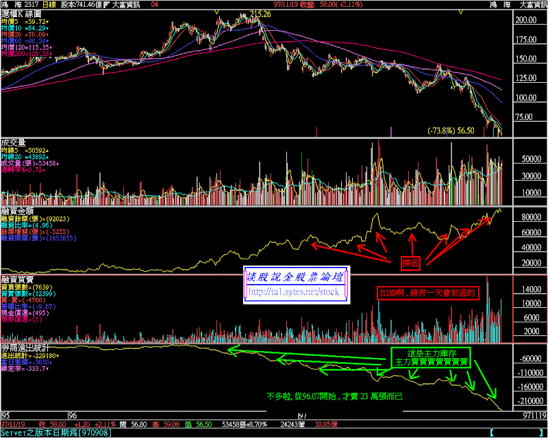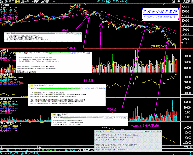 無法告知網友在 300 元出脫股票 , 真是罪大惡極 , 懇切的希望所有人能接受我的道歉 , 祈求各位的原諒 以下 , 是我從 96.09 開始 , 對於 2317 鴻海 的一些錯誤分析 , 敬請指教 !! 最後我還附加了一張圖 , 把這些錯誤的評論 , 加到當時的線圖中 , 這樣各位才能夠瞭解我犯了多大 , 且不可原諒的錯 .. 代碼: