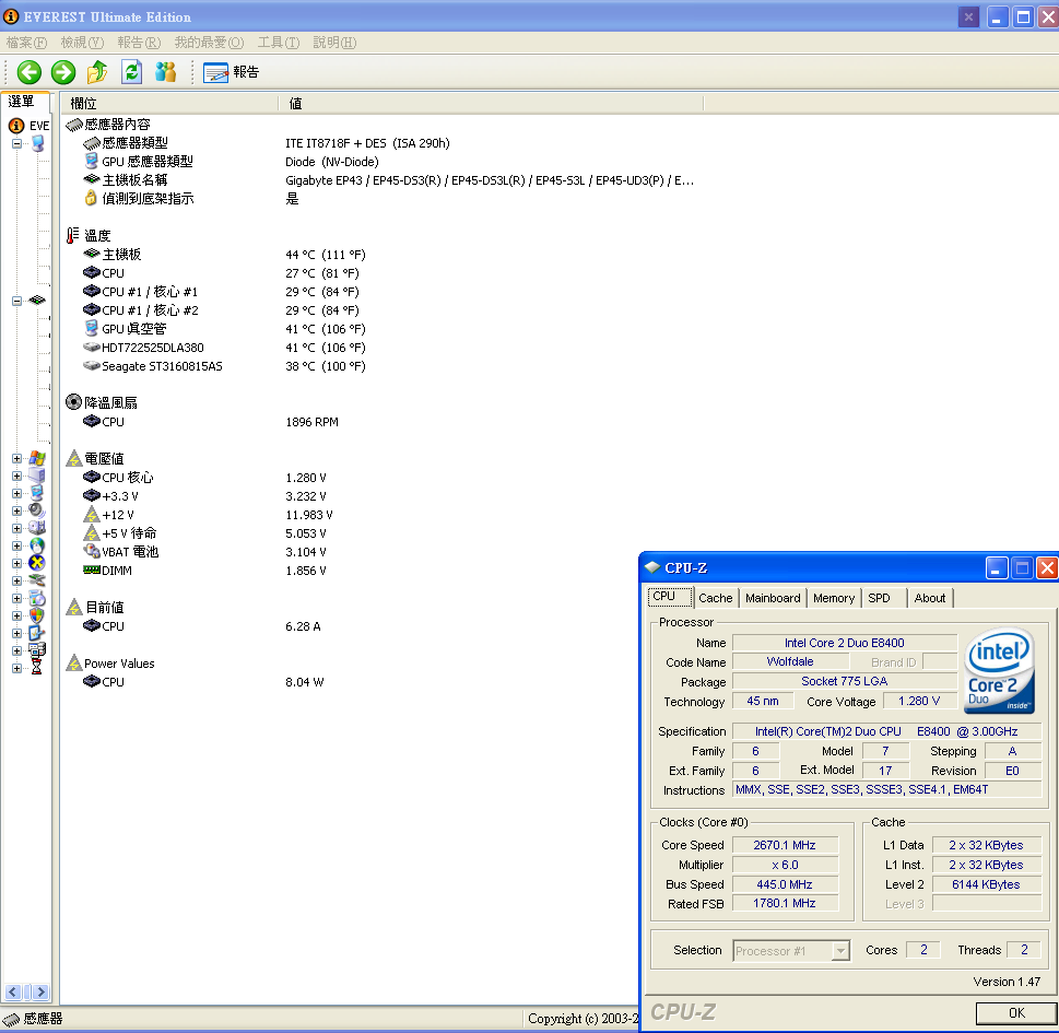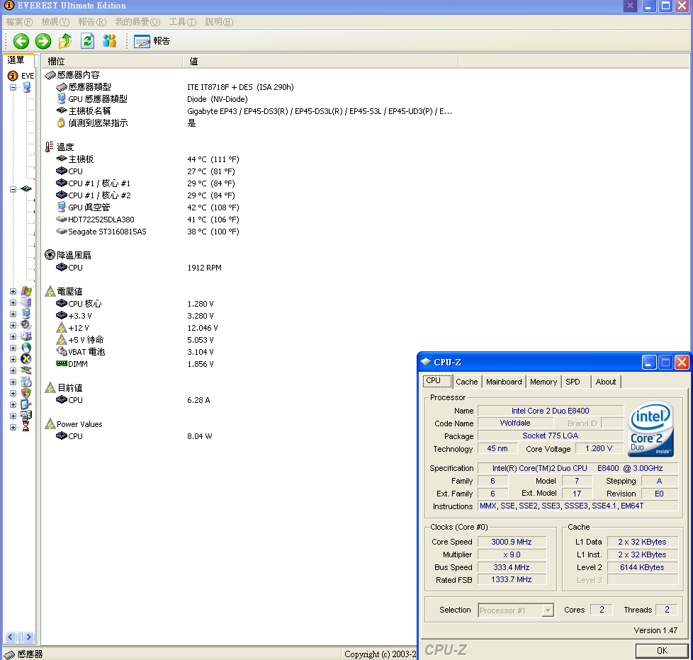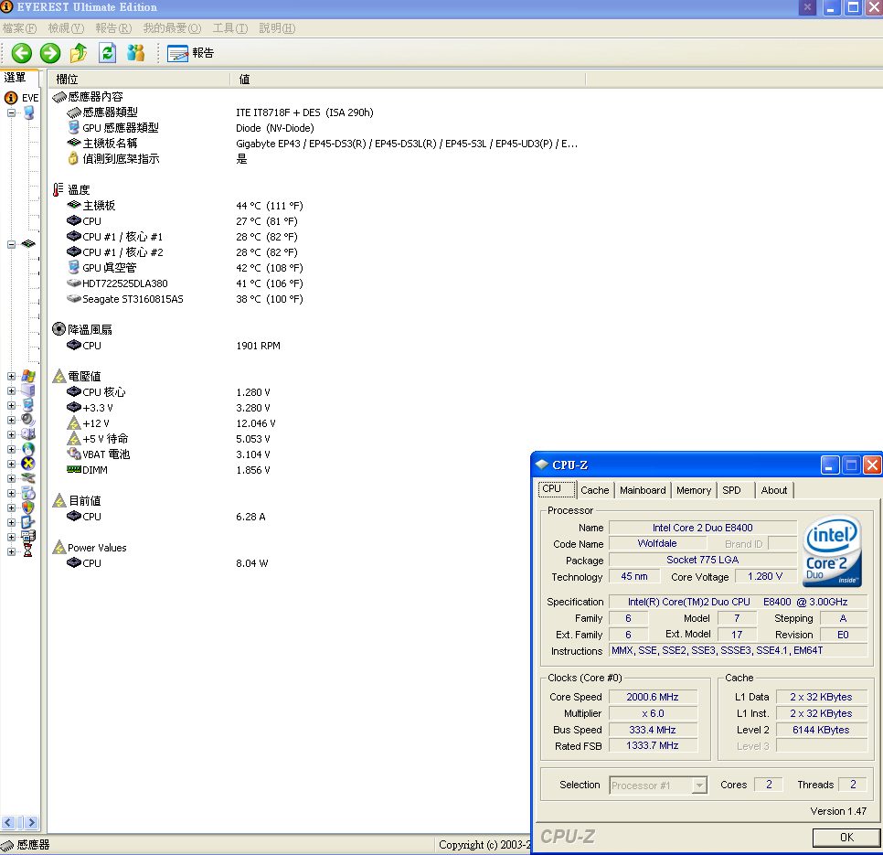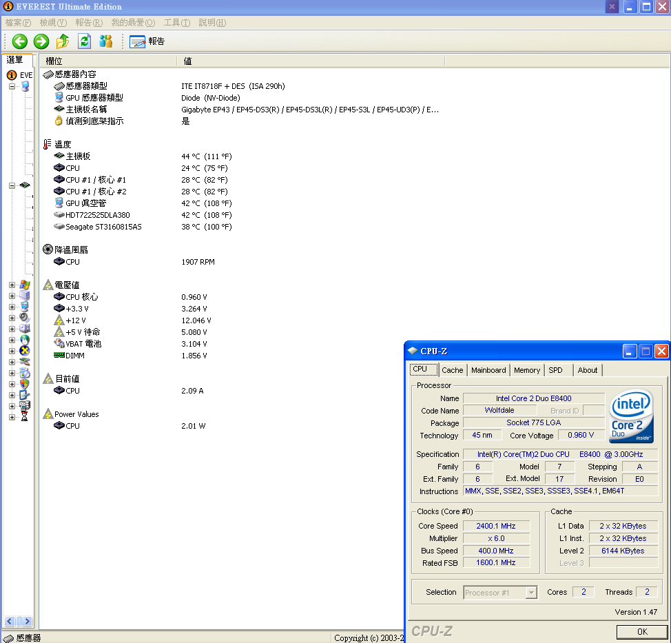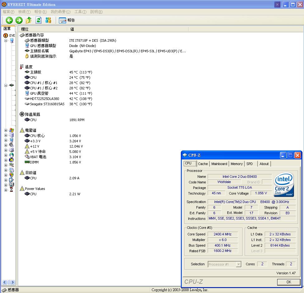 剛好 GA-EP45-DS3L 在 everest ultimate edition 4.6 可以看到cpu耗電量