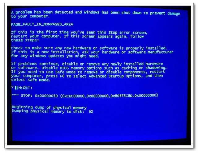 0x00000050:PAGE_FAULT_IN_NONPAGED ◆錯誤分析:有問題的記憶體(包括記憶體、L2 CACHE、顯示卡記憶體)、不相容的軟體(主要是遠程控制和防毒軟體)、有問題的硬體(比如:PCI插卡本身已損壞)等都會引發這個錯誤.