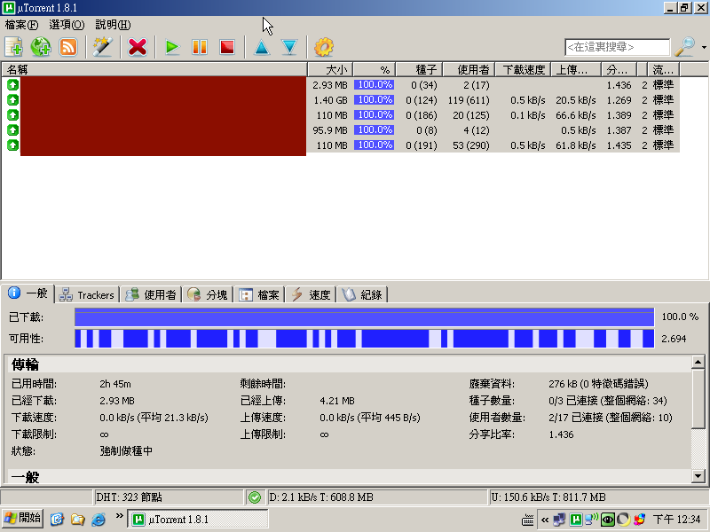 也來貼個圖, 目前是2009/01/01 ,時間下午 01:00左右取圖的 圖裡有我IP 連線address , 最後一碼我把它給塗掉,但是從IPv4的前三碼 可以知道這是SeedNet的IP address ... ![]() ![]() ![]() 今天是假日,但我還是在這個時段upload還是衝不上去 , 今天晚上 我再把我的upload 的頻寬附圖給貼上來 , 可以做個比照... 我對SeedNet無惡意,只是認為有做就承認就可以了... BT我沒測 , 因為沒甚麼想download的 .....