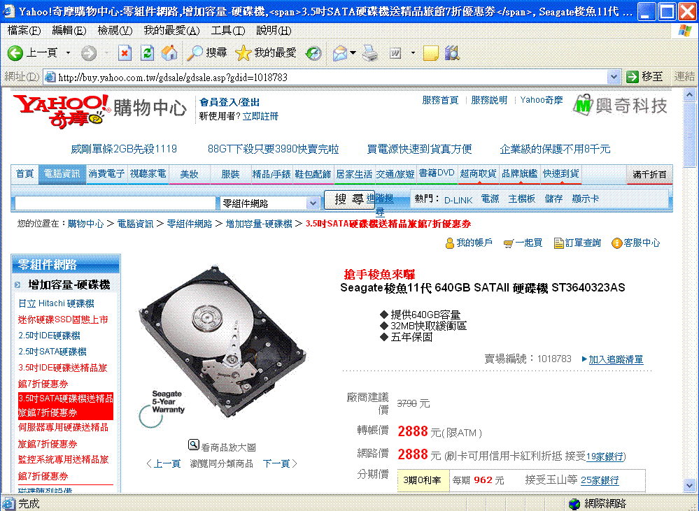 想說如果Seagate 640G 也有算那就太好了 結果點儲存子站進去看 好棒!有耶! 結果點Seagate 640G進去 竟然跑到零組件網路!? 於是我就寫信去客服中心詢問 7/31給我回個沒誠意的回答 您好: 為您說明記憶卡/碟和儲存 滿2,000送200購物金活動如下: 活動期間:97/7/31-8/13 活動方式:單日購買記憶卡/碟和儲存2子站(可跨站累計)商品滿2000送購物金200元,每人(帳號)每日限得一次。 付款限制:需扣除紅利點數折抵、購物金徵信後金額。 購物金發放日期:系統將自動計算是否符合資格,97/9/10發放預計隔日生效,購物金發放時將會寄送通知信。 相關活動說明網址: http://buy.yahoo.com.tw/temp/htm/al...how_popup_8.htm 哇咧!這是啥鬼回答 於是我又寫信去抱怨 8/1得到的答案是 賣場編號:1018783 Seagate梭魚11代 640GB SATAII 硬碟機 ST3640323AS 此為零組件網路子站商品,故未符合贈送購物金之活動,謝謝! 那我第二張圖看到的網頁是啥鬼 Yahoo!奇摩購物中心真的是回覆慢 而且弄得不清不楚 害我差點上當又浪費時間 ![]() |