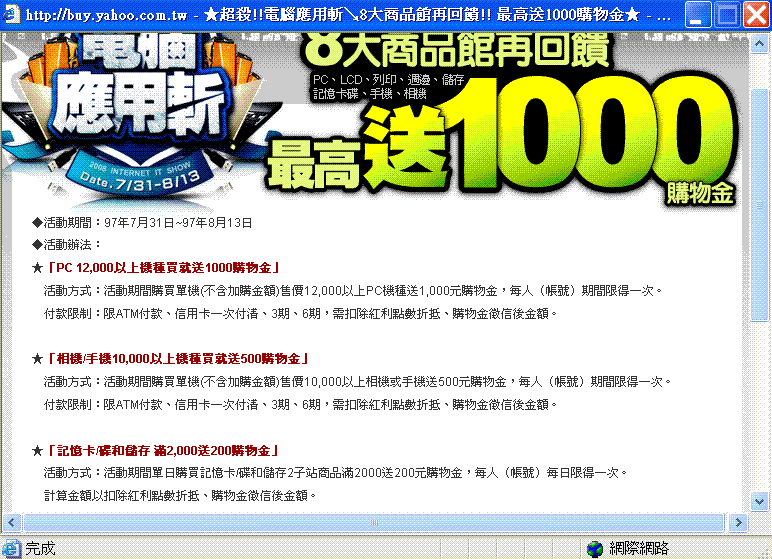利用無法得到的優惠誘人購物,在活動辦法跟連結裡動手腳使人上當受騙, 恐怕奇摩購物已經用這招騙到不少受害者了; 幸好有樓主踢爆,這應該廣為宣傳,宣導大家在網路購物前看清楚再動作... |