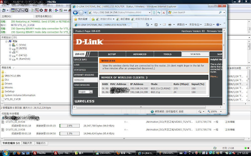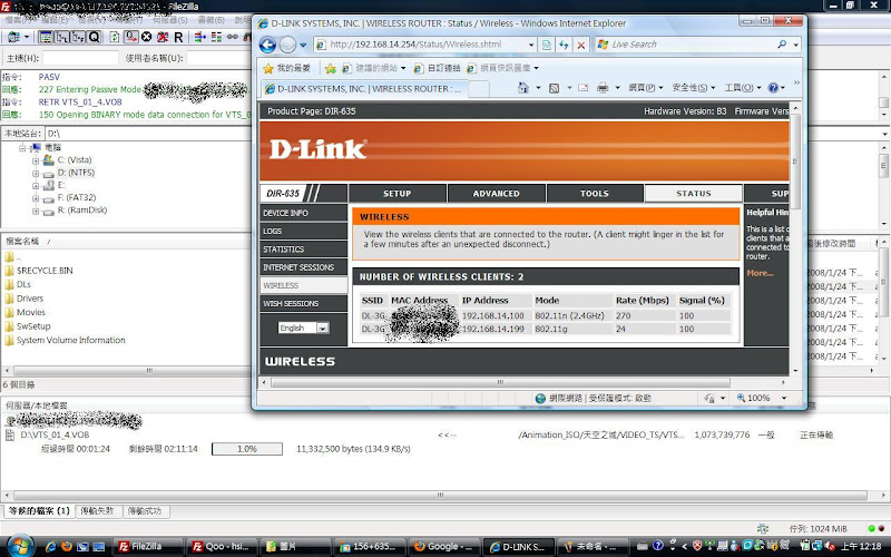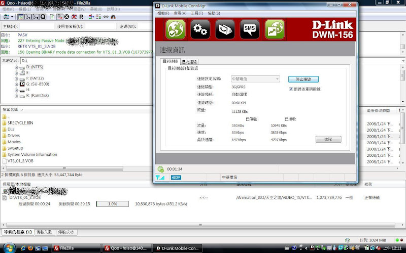 優點: 1. 還算穩, 買來用到現在只有三次不明原因機器自己 reset (入手時間大約兩個月) 2. 散熱應該還ok, 也可能因為我使用上都是把 AP 直立, 目前沒熱當過 3. Support 802.11n (only draft 1.0?), 目前市場上面有支援 11n 的 3G AP 不多 4. 此組合算相對便宜, 整套買起來只花了不到六千 5. 三年保固? 目前感覺沒啥用 缺點: 1. 不支援 PIN code unlock 另一台 DIR-451 有支援, 不過這台應該是 Linux based 而非像 DIR-635 為 Ubicom based 此 Function porting 的難度我不清楚 2. 只有 D-Link 自家的 AP 支援 DWM-156, 選擇性不多 3. 技術支援很差, 發一個 issue 居然客服回答我說 RD 已經在看會跟我回報等等等等的 網站上過幾天就"自動"幫我結案, 還要我自己去追問題, 一個簡單的問題可以拖近兩個月才回答 4. 有個 Use Advanced DNS Services 選項, 打開以後裡面的 DNS 資料都是很舊的 這個選項打開以後query的資料都是好幾個月前的, 造成部分網址會連不上 不知道這兩台 DNS 更新的標準在哪裡 mf.wan_primary_dns.value = "204.194.232.200"; mf.wan_secondary_dns.value = "204.194.234.200" 5. 透過 3G + WLAN (with WPA2+AES) 連線速度不穩, 速度會掉(不過這個問題可能還需要釐清), 有圖有真相 (1) 直接用 DWM-156 單點下載 ![]() (2) DWM-156 兩點 ![]() (3) + DIR-635 單點 ![]() (4) DIR-635 兩點 ![]() 五分鐘後 ![]() 不過後來我用直接接上 LAN port 的時候速度和直接接上 DWM-156 大約只差了一成 還算在可以接受的程度 但是透過 WLAN 的時候單點速度就會掉的很誇張大約只有1~200kB/s 但是多開幾條 session 的話 total bandwidth 又可以逼近直接用DWM-156的速度 大概最快只會剩下一半多一點 這點在 Intel 5100AGN 和 Broadcom BCM4318 上都一樣 但是這部份沒有時間做太多測試 我使用時間大概只有週末而已 |