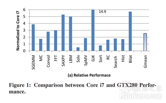 Intel在論文中表示,他們對一系列重要的吞吐計算內核進行分析後發現,其中很多都支援平行運算,非常適合多核心CPU或者GPU,但是過去幾年來,有很多研究聲稱GPU運行這些內核的速度可以達到多核心CPU的十倍乃至上百倍,因此Intel 找來了十四款平行運算內核,使用Core i7-960、GeForce GTX 280進行對比測試,操作系統為SUSE Enterprise Server 11,搭配CUDA 2.3開發套件,結果發現GPU的效率只比多核心CPU高出平均2.5倍,最多的也只有14.9倍。
