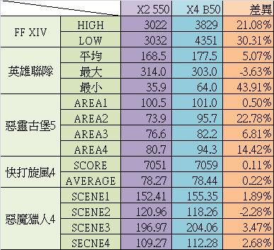 CPU : AMD Phenom II X2 550(非黑盒版) MB : ASUS M4A785TD-M EVO VGA : ASUS 5850 GDDR5 1G RAM : DDR3 2G*2 POWER : COOLER MASTER 500W 話不多說,就先來試試FINAL FANTASY XIV,然後測那另人熟悉的英雄聯隊、惡靈古堡、快打旋風和惡魔獵人。 FINAL FANTASY XIV high and low: X2 550 ![]() ![]() 分別是3022與3032,分數差不多,不知道怎麼回事呢。 X4 B50 ![]() ![]() High: 3829 Low: 4351 這個就比較正常一點了,並且確實比X2 550還多一些分數。 英雄聯隊的效能設定: ![]() X2 550 ![]() X4 B55 ![]() 平均值多了9張。 惡靈古堡5: X2 550 ![]() X4 B50 ![]() fps從81.3變成了92.6! 快打旋風4: X2 550 ![]() X4 B50 ![]() 分數看似差不多,多一點點的一點點而已。 惡魔獵人4效能設定: ![]() X2 550 ![]() X4 B50 ![]() 看起來也沒差多少的樣子。 然後來看看整理好的表格吧: 首先把重點放在ASUS 5850上,這是我第一次入手的萬元卡,玩起遊戲果然不是蓋的,不想敗家的人千萬不要輕易嘗試。因為玩過特效全開的遊戲畫面後,再看沒開特效的畫面,可以很明顯的看出之間的不同,我只想說高階卡才是王道阿...然後來看看開核玩遊戲有什麼差別,很明顯地在較新且有支援多核心,FF XIV與惡靈古堡上有不錯的加分;快打旋風與惡魔獵人則沒有太大差別;英雄聯隊則是需要大量的計算時,多核心是比較占優勢的。 總的來說,如果要玩近期的新遊戲,想擁有較好的效能,除了有張高階卡之外,有顆四核心的CPU也是不能少的配備!! |