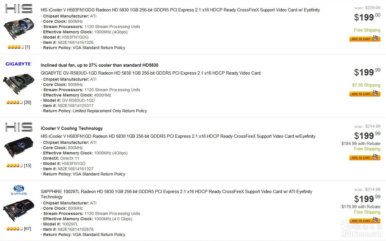 GeForce GTX 460的發布給NVIDIA陣營注入了一劑強心劑,也終於開始動搖AMD陣營堅挺了許久的價格體系,作為直接競爭對手的Radeon HD 5830就已經開始了全面降價。 在大陸市場上,Radeon HD 5830的建議零售價正在從1799元人民幣降至1499元,和GTX 460 1GB版本處於同一價位上,但仍然要比GTX 460 768MB版本貴200元。景鈦、雙敏等廠商已經率先開始按照新的價格銷售。 而在老家北美地區,Radeon HD 5830的降價幅度更大,從239美元直落至199美元,已經相當於GTX 460 768MB版本,顯然更加實惠。顯卡廠商的動作也同樣迅速,在亞馬遜、新蛋等大型購物網站上已經有藍寶、技嘉、HIS等拉低到200美元之下。 歐洲方面也在迅速跟進,比如技嘉已經將其價格降低到了僅僅179歐元。 Radeon HD 5830目前的主要優勢包括ATI Eyefinity多顯輸出技術、4GHz GDDR5高頻率記憶體、1.792TFlops浮點性能、上市較早版本眾多等等,GeForce GTX 460則擁有更強的綜合性能、更多的渲染後端(24個)、更好地超頻性、CUDA/PhysX/3D Vision等一系列獨家技術,源碼輸出方面據稱也已經趕上。 -- 啊那個5850咧?