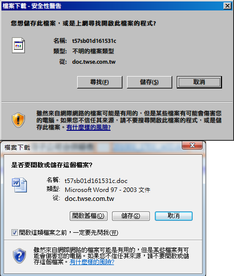 點選後會跳出IE下載的對話框(開啟、下載、取消) 然而這是在裝有M$ Office的電腦上的情況... 在安裝OpenOffice的電腦上遇到一個問題... 該文件沒了副檔名且對話框第一項變成了「尋找」 是OpenOffice無法會自動判定為它為doc文件嗎? 圖上/下為裝有OpenOffice/M$ Office的系統 ![]() |