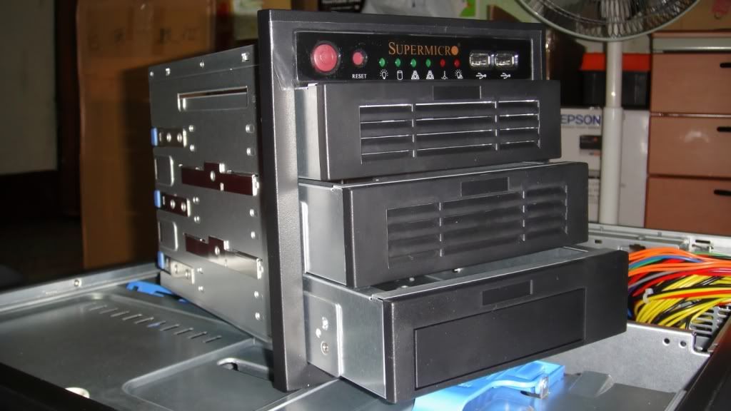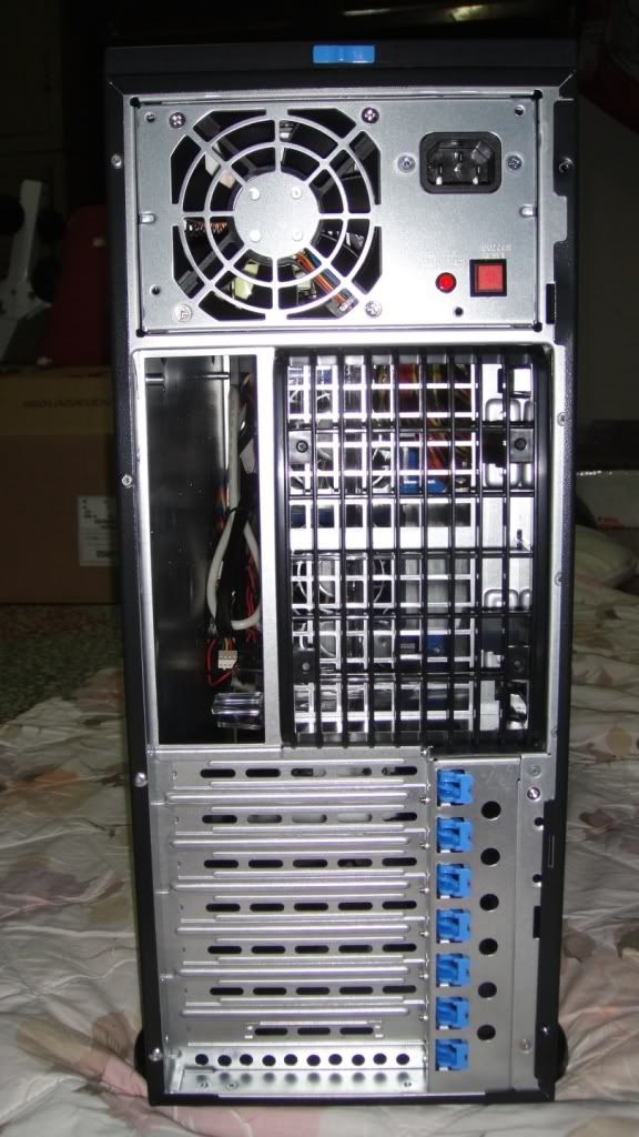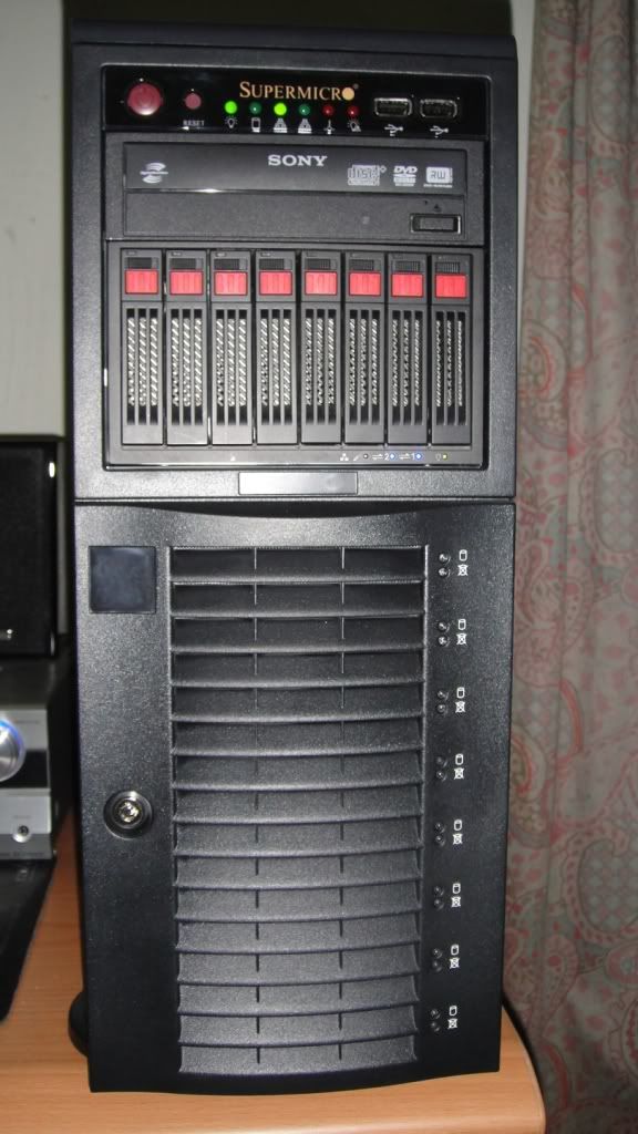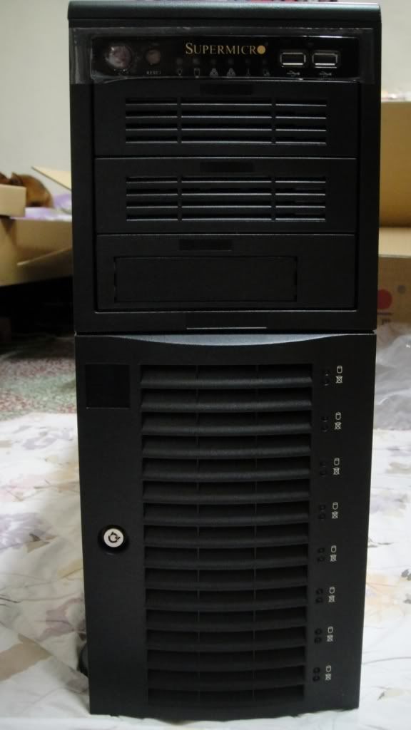 所以.. ![]() ![]() 拉拉拉拉啦....!! 突如其來....!! 阿....!!這是啥??.... ![]() 大大的字樣 "SUPERMICRO" 真是深得我心、重到不行... 整體重量達到將近26Kg... 這是啥鬼阿...!! ![]() 先翻來看看到底是甚麼鬼東西這麼重??? ![]() 真是辛苦... 兩層箱子... 我在翻.. ![]() ![]() 答案揭曉了...!! SuperChassis 743TQ-865B (Black) ,而且還是最新版的.... 看看其他外觀... ![]() 整體俯視... Height 17.8" (452mm) Width 7.0" (178mm) Depth 25.5" (648mm) ![]() YY的字樣.... ![]() 開始開側板,側板開關... ![]() 背後部分... ![]() 有一個9x9風扇的大模組.. 直接吃掉兩個9x9位置... 實際上可以裝兩顆9x9風扇... FAN-0103L4或著FAN-0091L4 此版本不提供.. ![]() 連風扇也沒有,只好自行加裝.... ADDA的3900RPM風扇... 只有70~80左右的CFM... |