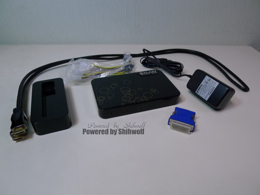 HDMI 線材 x 1, DVI轉接頭 x 1, 6Pin 電源轉接頭 x 2, Wireless HDMI 訊號接收盒 x 1, 底座 x 1, 訊息接收盒專屬電源 x 1.