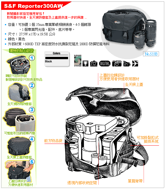 趁今天回娘家,就敗吧! 盒子 ![]() ![]() 盒內一些配件、軟體、保證書.... ![]() ![]() a55 body ![]() ![]() 現在買都送原廠包跟8G記憶卡 原廠個人覺得真是很醜,還是拿出塵封已久的 Lowepro S&F Reporter 300 AW來用吧! ![]() Lowepro S&F Reporter 300 AW 原廠官方圖片 ![]() 配件還沒買齊,先買電池跟UV保護鏡,保護鏡原本是想買B+W c/p高 但怕UV+偏光鏡時,會有暗角,所以還是買蔡司的,價差超過1倍 電池直接買超值包2顆原廠 ![]() ![]() 接下來就是鏡頭了,比A55還早買好放著 說到索尼的鏡頭就讓人生氣,16105跟35mm F1.8定焦鏡 缺到翻掉,連網路拍賣都沒貨賣,有時少量到貨,也被馬上秒殺 後來終於搶到一顆香港來的16105 索尼真是會做生意 ![]() ![]() ![]() ![]() 還有一些鏡頭沒買,再陸續看看 烏骨G還蠻想敗的 找一些事讓自己忙,或許可以忘記煩惱 謝謝收看 希望大家永遠沒煩惱 PCDVD萬歲~ ![]()