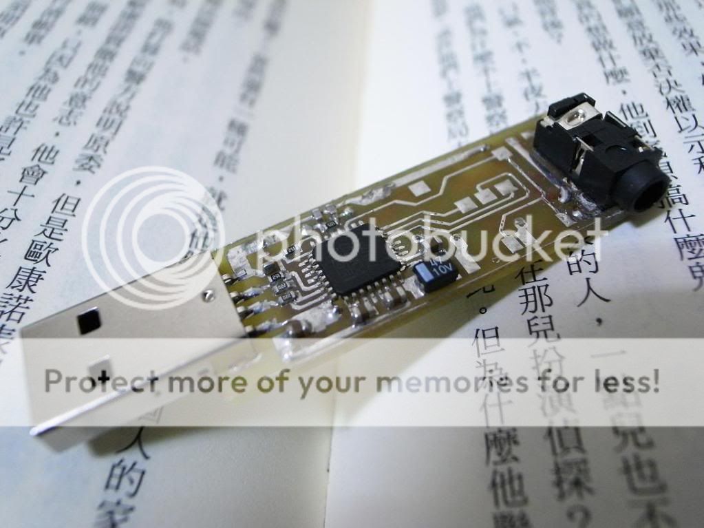 下列圖是自己DIY USB DAC (TI的 PCM2706和PCM2707都可) 以上兩顆晶片datasheet辜狗一下都有,輸出的交連電容可依需求自行更換, 樂趣更多 我有多做,有需要的話可以賣你 小小一片,直接跟耳機放一起,免驅動,插上去就可以明顯感覺到與內建的差別. ![]()