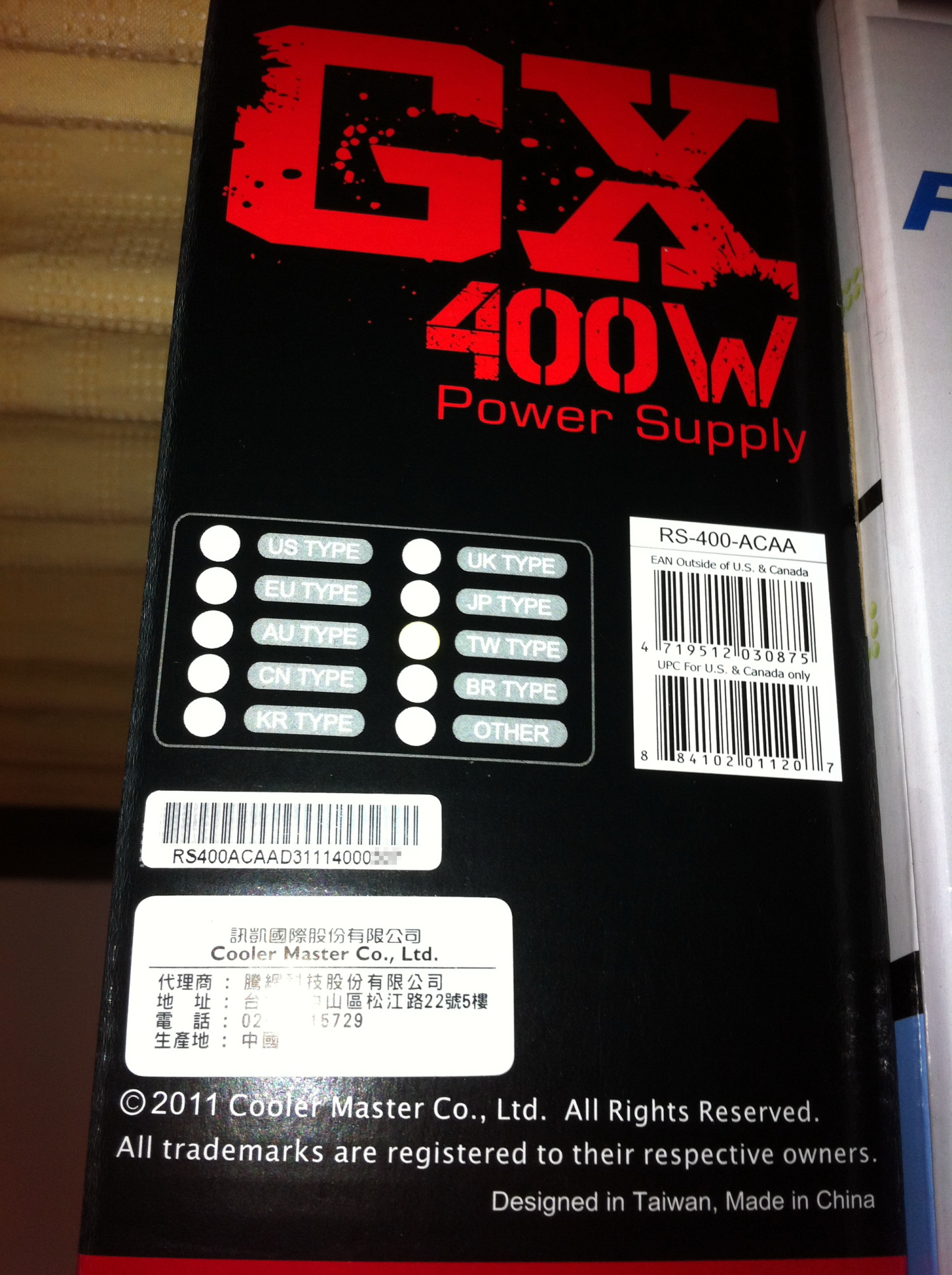 1.產品名稱 : 酷媽 Cooler Master GX400 80Plus 銅牌-電源供應器