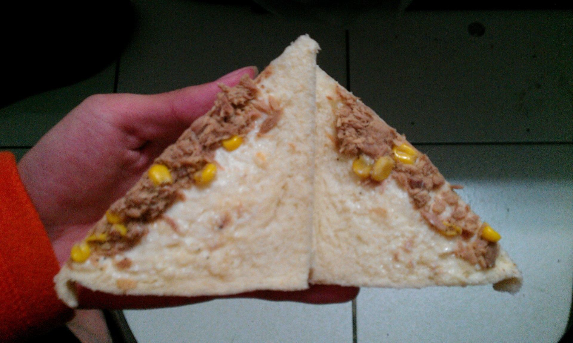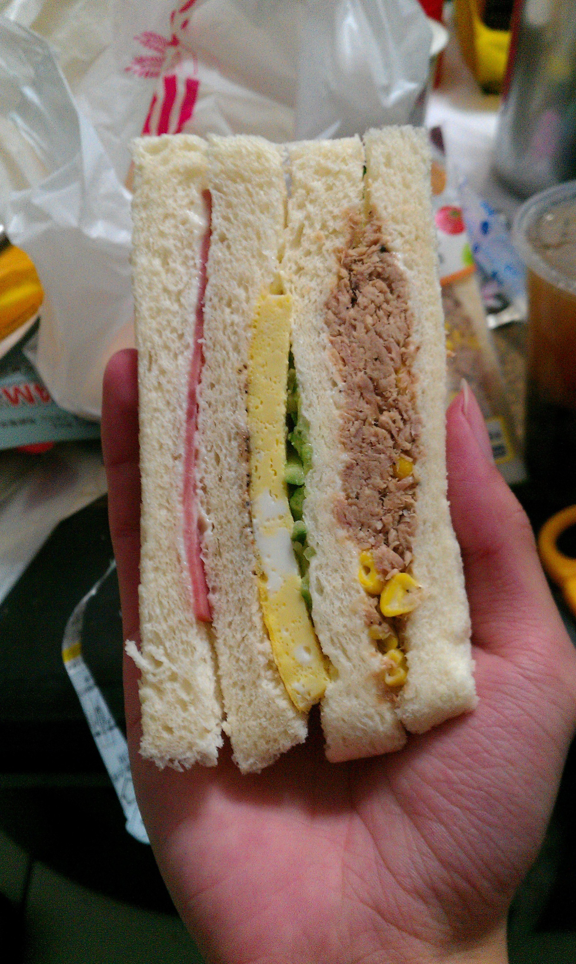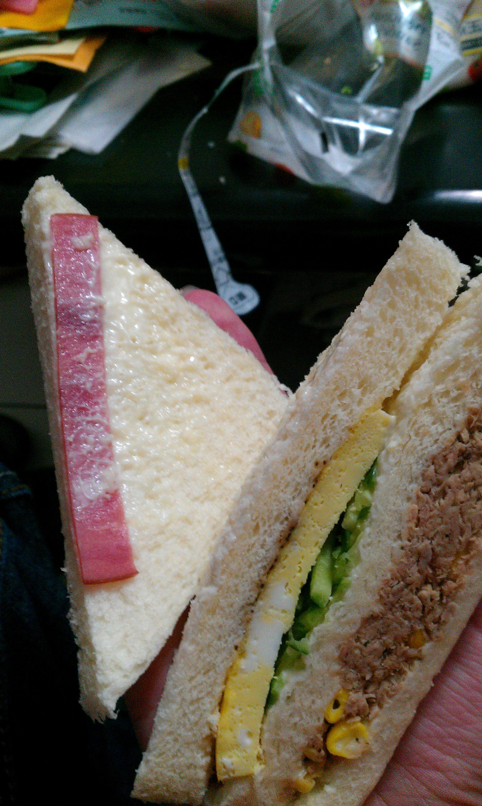 擺在一旁現成的三角形三明治 裡頭的火腿也是這樣細細一條 真不知道是誰學誰來著 |