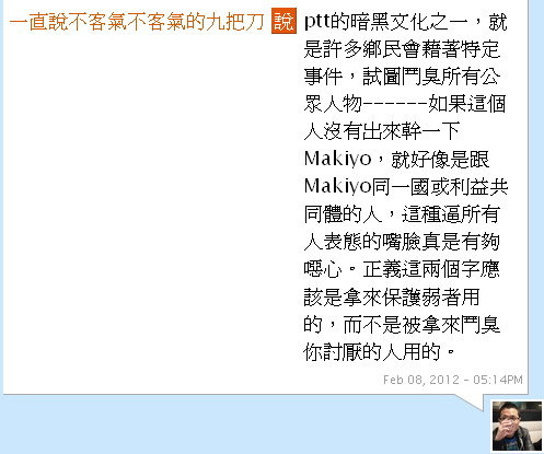 ¤E§â¤M¼g¹D¡A¡uPTTªº·t¶Â¤å¤Æ¤§¤@¡A´N¬O³\¦h¶m¥Á·|ÂǵۯS©w¨Æ¥ó¡A¸Õ¹Ï°«¯ä©Ò¦³¤½²³¤Hª«------¦pªG³o­Ó¤H¨S¦³¥X¨Ó·F¤@¤UMakiyo¡A´N¦n¹³¬O¸òMakiyo¦P¤@°ê©Î§Q¯q¦@¦PÅ骺¤H¡A³oºØ¹G©Ò¦³¤HªíºAªº¼LÁy¯u¬O¦³°÷äú¤ß¡C¥¿¸q³o¨â­Ó¦rÀ³¸Ó¬O®³¨Ó«OÅ@®zªÌ¥Îªº¡A¦Ó¤£¬O³Q®³¨Ó°«¯ä§A°Q¹½ªº¤H¥Îªº¡C¡v