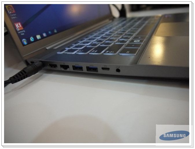SAMSUNG筆記型電腦的頂級款─9系列,產品型號是NP900X3A-B04TW。左邊周邊依序為電源孔、有線網路孔、Micro HDMI、USB 3.0和喇叭。