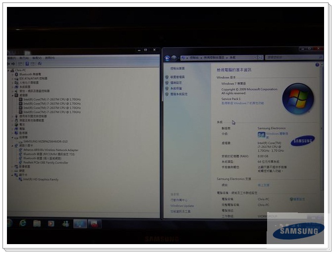 一樣打開裝置管理員查看規格,採用Intel Core i7 2637M 處理器,時脈為1.7GHz;8GB記憶體;內建256GB SSD;內建顯示晶片,使用Windows 7專業版。