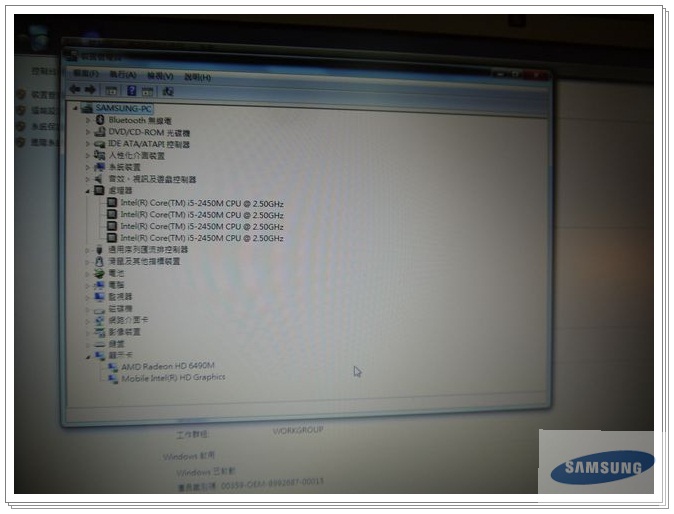 打開裝置管理員看規格,採用Intel Core i5 2450M處理器,時脈2.5GHz。支援雙顯示晶片,獨立顯示卡為ATi  Redeon  HD6490M。