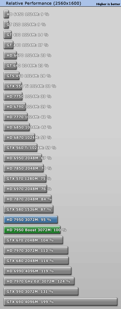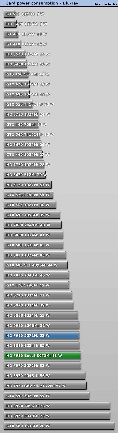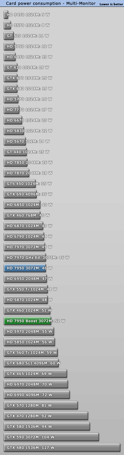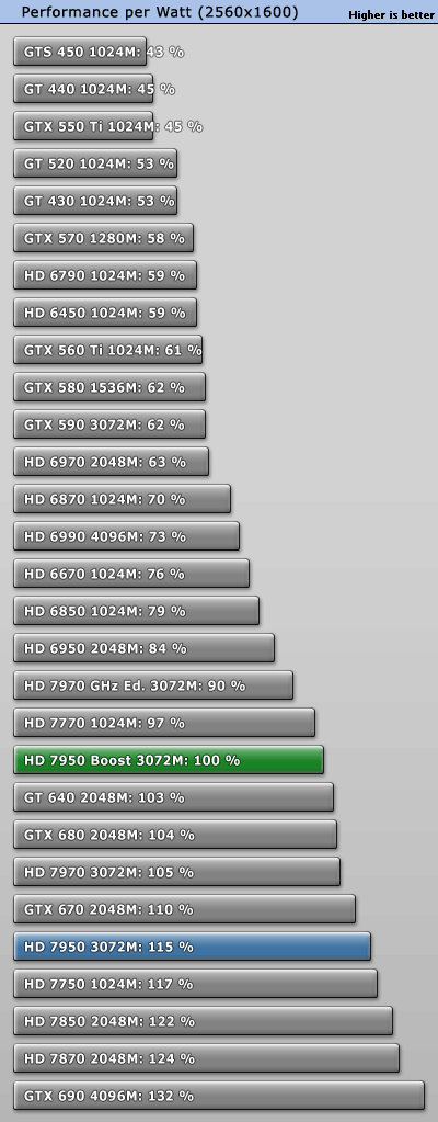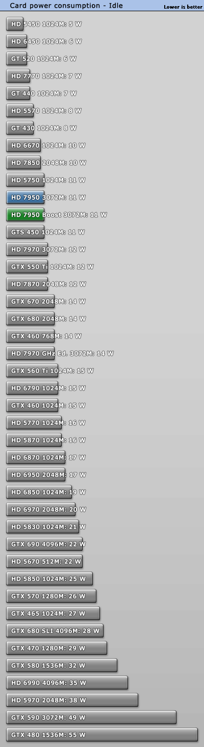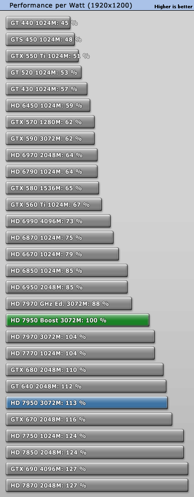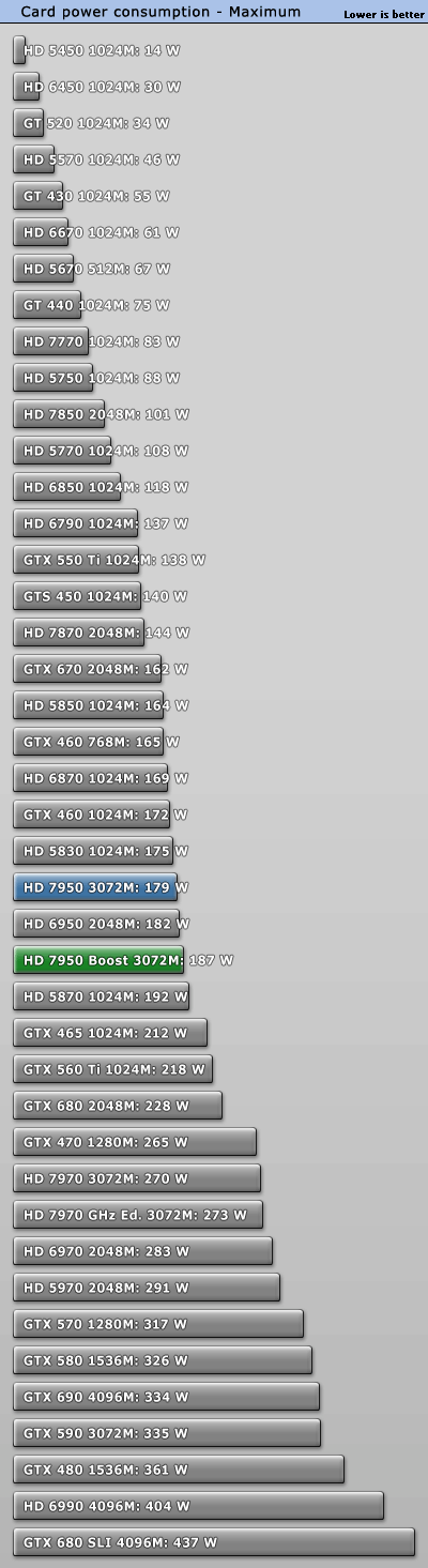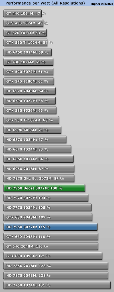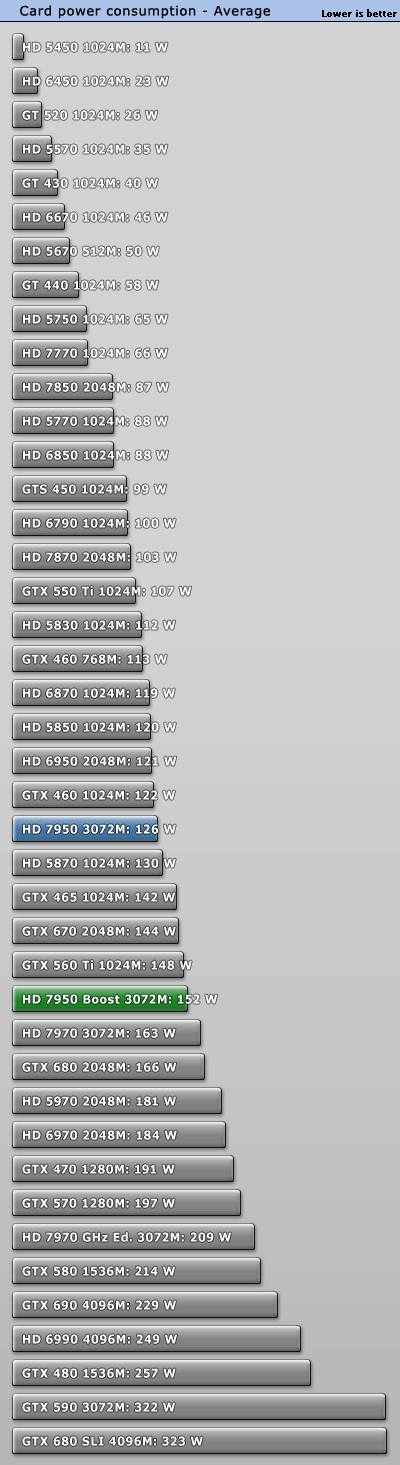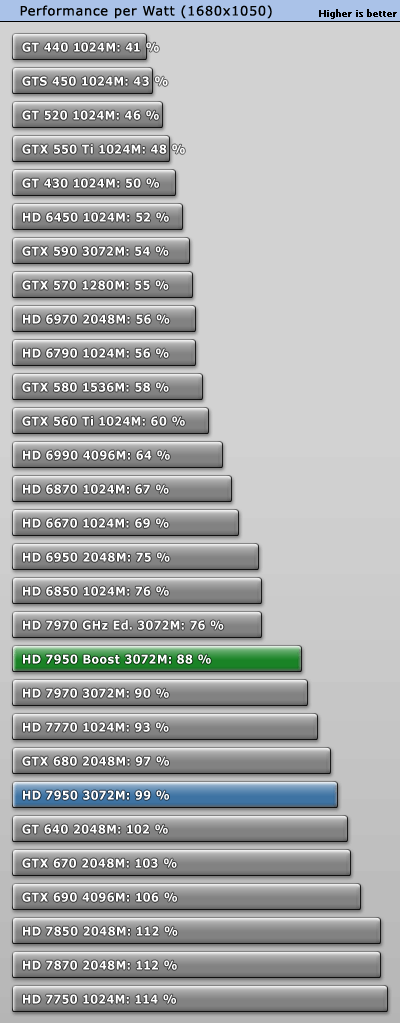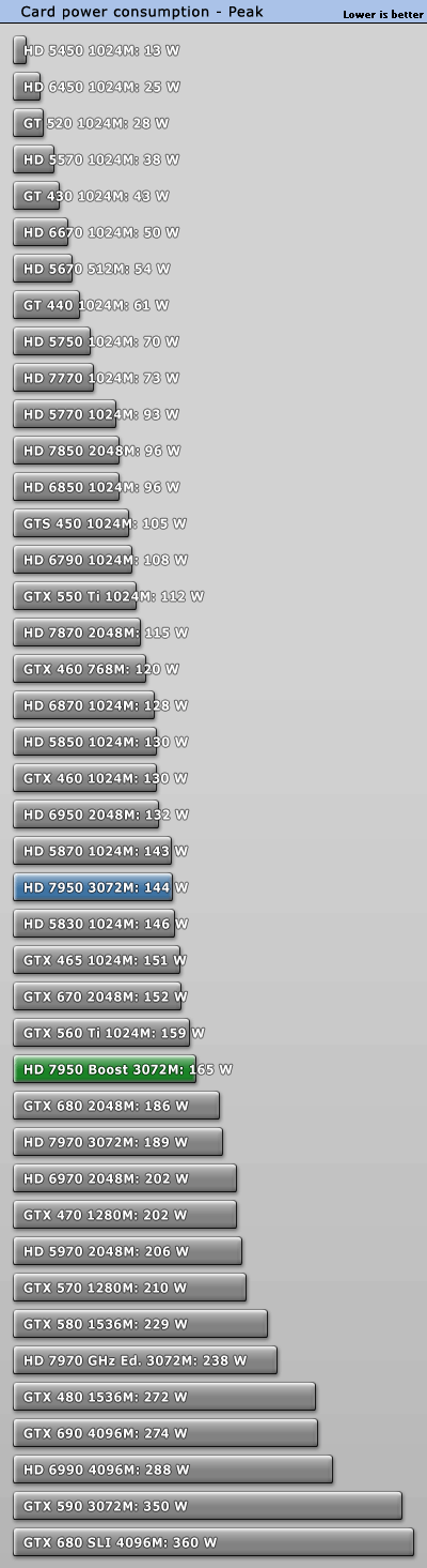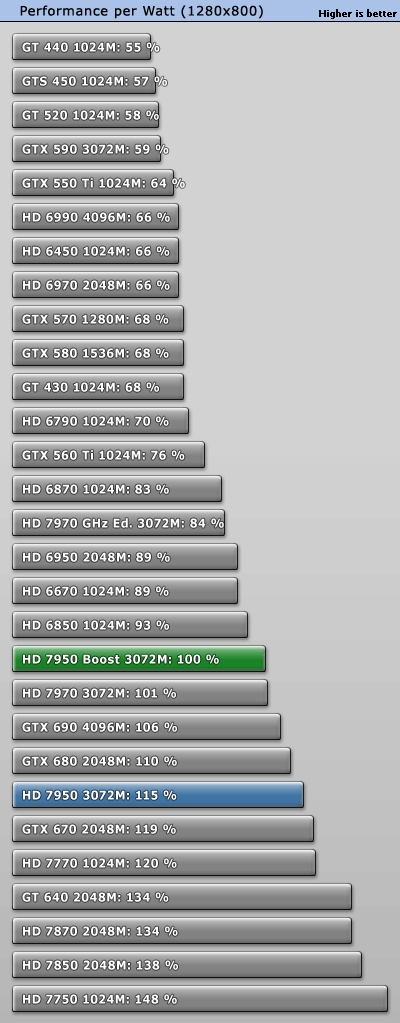 GeForce GTX 660 Ti正式發佈之際,AMD毫不客氣地開始了「攪局」:已有大半年之久的Radeon HD 7950獲得一次BIOS升級,刷新後即可將核心頻率從800MHz提升到850MHz,同時獲得PowerTune with Boost動態加速功能,在需要的時候進一步自動提至925MHz。 不過除此之外其他規格完全不動,包括VRAM頻率仍是5000MHz。當然了,熱設計功耗肯定會增加一些,但是AMD尚未公佈具體值。 另外,新BIOS還會將催化劑控制中心裡的超頻限制提高100MHz,達到核心1200MHz、VRAM 1575MHz(等效於6300MHz)。 可以刷新的前提條件是你的Radeon HD 7950必須是完全公版PCB,而從現在開始起所有新製造的Radeon HD 7950都會預設刷上新版BIOS,價格則與舊版完全相同。 這就是Radeon HD 7950刷新前後的對比,注意BIOS版本、核心頻率、像素/紋理填充率。因為API未開放,現在的監控工具還無法反映即時頻率,比如這裡就只顯示了加速值925MHz。 順便再講解一下AMD、NVIDIA不同的動態加速機制,和我們之前理解的有些不一樣: NVIDIA GPU Boost用的是「加法」,在任何需要和可能的時候提升核心頻率,AMD PowerTune with Boost則是「減法」,預設運行在較高頻率上(這裡是925MHz),檢測到功耗即將超標的時候就降下來(這也解釋了GPU-Z為什麼直接顯示925MHz)。 不同於NVIDIA,AMD沒有使用任何專門的硬體監控電路,而是純粹依賴GPU執行的一種算法,借助內部GPU性能計數器來估算功耗。這樣做的好處是任何顯卡都會表現完全一致,與流水線無關,也能降低成本。 很多人沒注意到的是電壓的變化。Radeon HD 7950身上,原來的核心電壓是1.07V,現在提高到了1.12V。這能保證高頻率下的穩定性,但代價就是功耗會明顯增加。 之前我們已經看過一部分測試,TechPowerUp又針對刷新前後的Radeon HD 7950做了更深入的對比,包括詳細的功耗、溫度等等。 測試平台使用了Core i7-3770K OC 4.7GHz處理器、華碩Maximus V GENE主板、海盜船Vengeance DDR3-1600 4GB×2 DRAM、WD藍標WD5000AAKS 500GB、Windows 7 64-bit操作系統等等,驅動程式A卡是催化劑12.7 Beta,N卡是304.79 Beta。 因為測試項目太多,我們就不一一列舉了,只看總結: 綜合來講,Radeon HD 7950提速後帶來了平均5.3%遊戲性能增長,而且不同解析度下基本一致。同時價格不變,性價比也有相應地提升。 再來看看功耗(單指顯卡本身): Windows 7系統桌面待機時都是11W,完全沒變。 雙螢幕待機功耗從46W增加到52W,多了13%。 ![]() 藍光高清播放功耗從52W增加到53W,可以忽略不計。 《Crysis 2》遊戲平均功耗從126W增加了超過五分之一而到152W,差不多快趕上了Radeon HD 7970。 《Crysis 2》峰值功耗從144W增加了15%而達到165W,不過還是比GeForce GTX 680/Radeon HD 7970低很多。 FurMark燒機最大功耗從179W增加到187W,只多了不到5%。 以典型遊戲功耗為例,能耗比(單位功耗的性能)變化如下: Radeon HD 7950加速後能耗比下降了13%之多,代價不菲。 最後是溫度: 因為負載功耗上去了,相應地溫度也略有增加,不過3℃的變化還可以接受,也沒有超過80℃大關,而待機時仍保持在39℃。