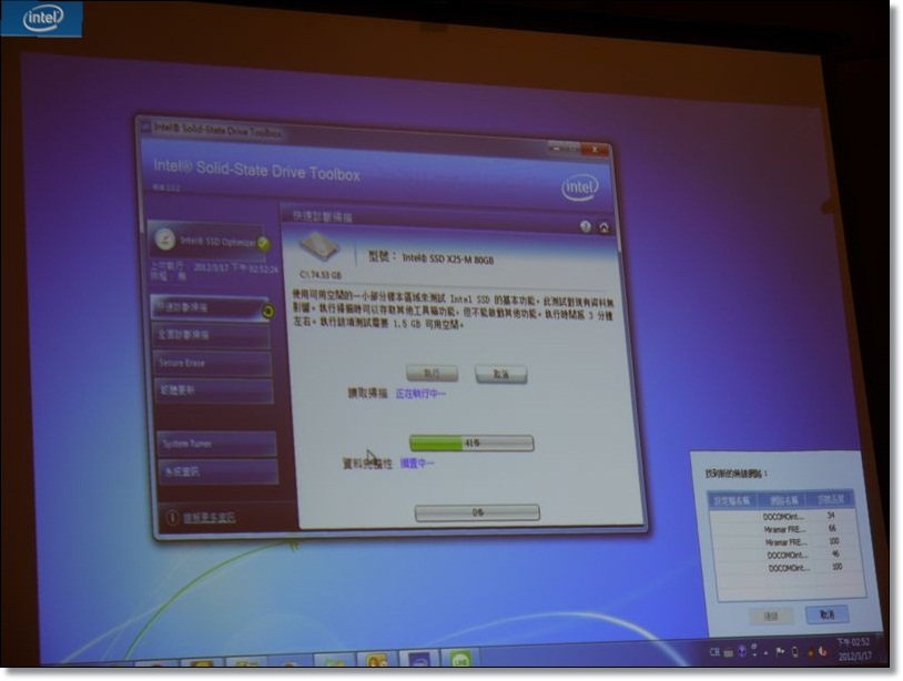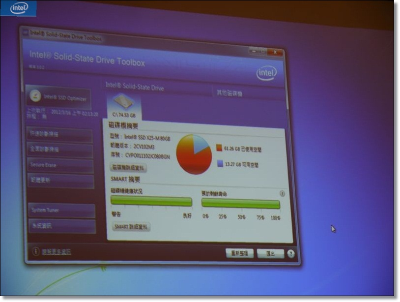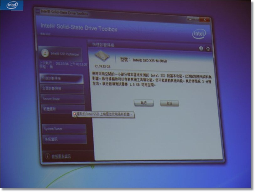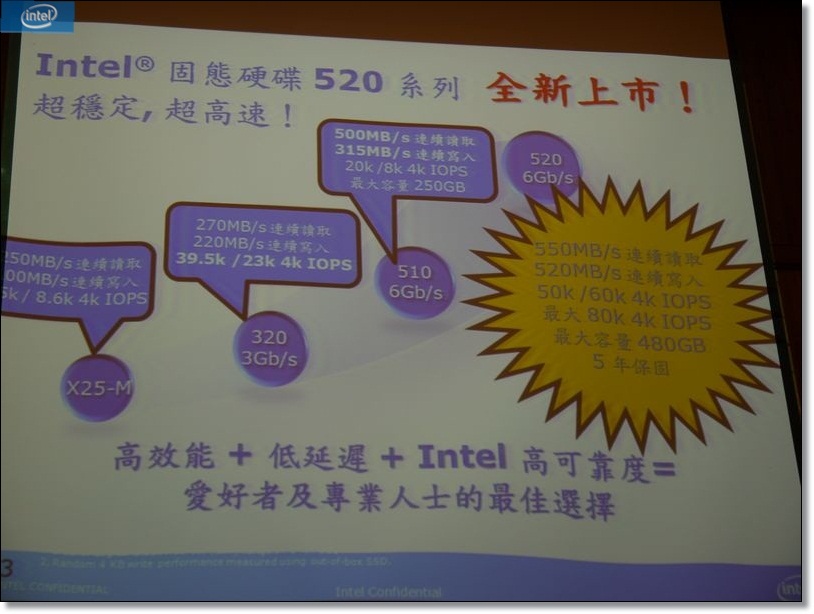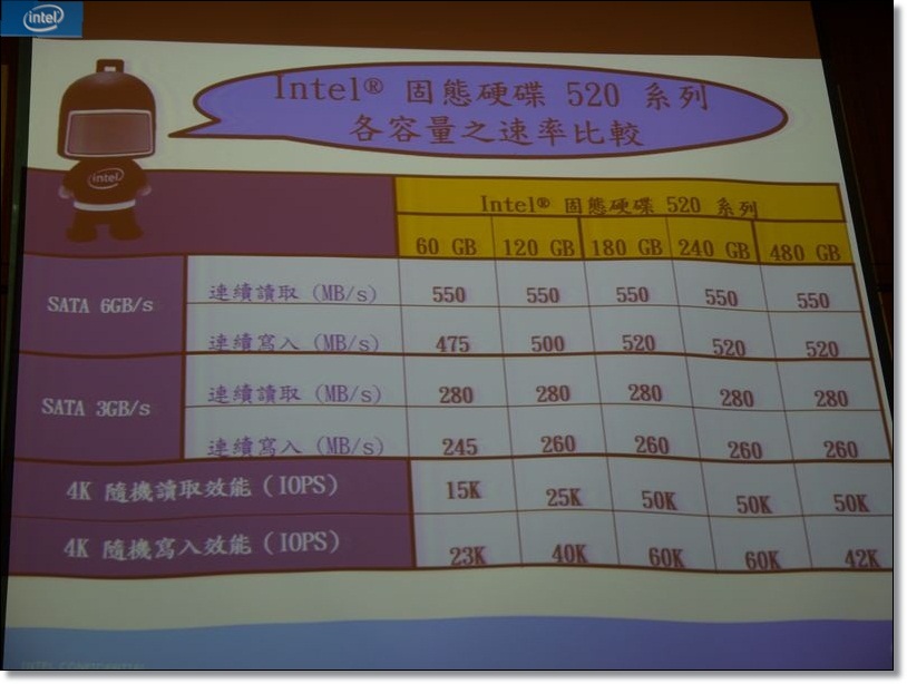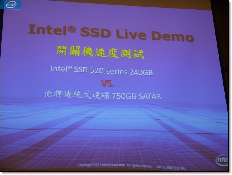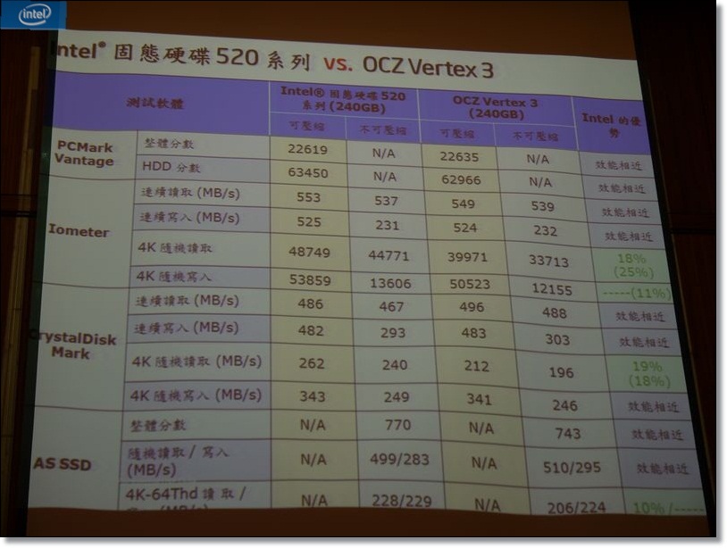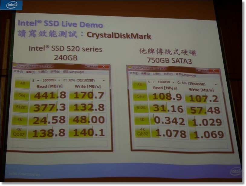 我個人知道SSD是在ASUS的第一代Eee PC,那時候還是7吋,容量很小又很貴,去年因為泰國水災的關係,傳統硬碟價格飛漲,不少人也就因此換成了SSD,SSD速度快,換過的人都會說:「我回不去了」,裝在筆電很適合,因為SSD不只速度快,可以立刻開機立刻使用,而且還不怕震動,不會有傳統硬碟壞軌的問題。 ![]() 這是活動的美麗信花園酒店,外觀相當漂亮。 ![]() 進入酒店後,看到了活動的立牌。 ![]() 這是ASUS的N45SL,將原先的HDD改為Intel的SSD。 ![]() Antec除了機殼和電源供應器外,還有筆電用的風扇。 ![]() Antec的清潔液、水冷散熱器和電源供應器。 ![]() MSI GT780筆電,硬碟換成Intel 520 SSD 120GB。 ![]() ![]() 這台則是MSI GT683,採用Intel Core i7 處理器,GTX 560M顯示卡及8GB的記憶體。 ![]() 餐點時間,有甜點、飲料、牛奶和水果。 ![]() ![]() 在排隊的時候,隨手拍了一下酒店的景觀,真的十分漂亮。 ![]() 現場擺了筆電,更換的部分只有SSD,用來比較SSD和傳統硬碟的速度。 ![]() ![]() 就如文章一開頭提到的,CPU年年效能都是增加好幾倍,從單核心、雙核心到四核心,但是CPU和顯示卡效能增加了,開機卻還是很久,Windows 7的效能指數永遠只有5.9,因為效能瓶頸在於硬碟,如果用傳統硬碟,就算主機板有支援SATA 3,那也是很浪費,一旦換上SSD,效能提升在開機速度和開啟應用程式上就會有很明顯感受了,後面有Demo影片。 ![]() 首先介紹的是Intel在SSD家族產品定位有分為900系列、700系列、500系列和300系列,一般消費者根據預算去選擇500系列或是300系列就足夠了。 ![]() Intel的SSD從X25-M的250MB連續讀取/100MB連續寫入,到320的270MB連續讀取/220MB連續寫入速度,現在520系列可以有550MB連續讀取速度,SSD讀寫速度有了大幅提升,而且保固還升等到5年保固。 ![]() 這張表格是520系列在各容量的測試結果,180GB這個容量是SSD中比較少看到的容量,從這表格還可以發現180GB之後讀寫都維持在同一個速度,所以如果預算足夠,180GB是個不錯選擇。 ![]() 再把Intel 520系列與310系列和510系列作比較,25奈米製程、SATA 6Gbps、550/520讀寫速度、支援AES-256bit加密技術以及提供5年保固,都是勝過其他系列的部分。 ![]() 買了硬碟,使用者最怕的是資料遺失,這是很現實的,如果沒有備份,資料就是消失,你做了很久的報告或是企劃案就得從頭再來,根據Behardware的資料顯示,OCZ的年退換率最高,而Intel的年退換率則是0.1%,當然將資料多備份到幾個不同地方才是最保險的。 ![]() Intel 520系列SSD與WD一萬轉硬碟的讀寫速度採用幾款知名的效能測試程式做比較,最高勝出182%。 ![]() Intel 520系列SSD與Crucial M4(C400)做讀寫效能比較,最高勝出80%。 ![]() Intel 520系列SSD與OCZ做讀寫效能比較。 ![]() Intel 520系列還針對資料保護功能做加強,支援AES-256bit加密技術。 ![]() 只要購買Intel的SSD都可以到官方網站下載實用工具,一個是SSD Toolbox,另一個則是資料轉移軟體。 ![]() Toolbox可以優化你的SSD,也可以永久刪除資料。 ![]() 這是Intel SSD Toolbox的執行畫面,可以看到SSD的詳細資訊。 ![]() 全面診斷掃描,如果發現SSD可能有點怪怪的,可以進行掃描。 ![]() 快速啟動掃描,使用可用空間的一小部分來測試SSD的基本功能,掃描過程中需要1.5GB可用空間,執行時間約3分鐘左右。 ![]() Intel SSD Toolbox的優化功能,需要1GB以上的可用空間。 ![]() 執行Intel SSD Toolbox的快速掃描功能中...... ![]() Intel SSD Toolbox的Secure Erase可以永久刪除資料。 ![]() 第二套軟體則是資料的轉移,買了新的SSD,最麻煩的就是資料轉移了,Intel與Acronis合作提供資料轉移的軟體,輕鬆就可以將資料轉移到SSD。 ![]() 這款軟體叫做Intel Data Migration Software。 ![]() 將SSD連到電腦,並且選擇來源硬碟。 ![]() 再選擇目標硬碟(SSD)。 ![]() 然後軟體會告知你要從哪顆硬碟轉到哪顆硬碟,確認無誤按下確定就會開始執行資料的搬移。 ![]() 前面的一部份過程會在Windows底下執行,之後電腦會重開機,繼續完成後續轉移的部分。 ![]() 這是重開機後顯示的資料轉移進度畫面。分為分析、鎖定和檢查等步驟。 ![]() 這是轉移的步驟4,告訴你從硬碟1到硬碟2,檔案格式為NTFS,容量為74GB。 ![]() 資料轉移軟體,可以完全地將作業系統、應用程式等設定保留轉移到新的SSD上,時間大約需要20分鐘 ![]() 接著是SSD與傳統硬碟的開機速度測試,不過這邊我沒錄影到。 ![]() 軟體執行速度測試,Intel寫了一支Script,開啟大家常用的程式模擬平常使用情況。 ![]() Intel SSD開啟應用程式只要45秒,750GB需要100秒。 ![]() 讀寫效能當然也不用講,完全大勝傳統硬碟。 ![]() 不論哪一個項目,都大幅贏過傳統硬碟,最多贏過400%,這麼好的SSD,你還不買嗎? ![]() ![]() 同台筆電,上圖是WD 750GB傳統硬碟,下圖將硬碟換成Intel SSD 120GB。以開機到桌面為例子,傳統硬碟需要36秒鐘,SSD只需要14秒,節省一半以上時間。 ![]() ![]() 傳統硬碟750GB與Intel SSD 240GB做比較,Intel SSD 520系列讀寫最快可以達554MB/522MB。 ![]() ![]() ![]() ![]() ![]() 同一時間,資料轉移也已經完成了,所以工作人員將硬碟換上SSD,證明資料轉移完全正常。