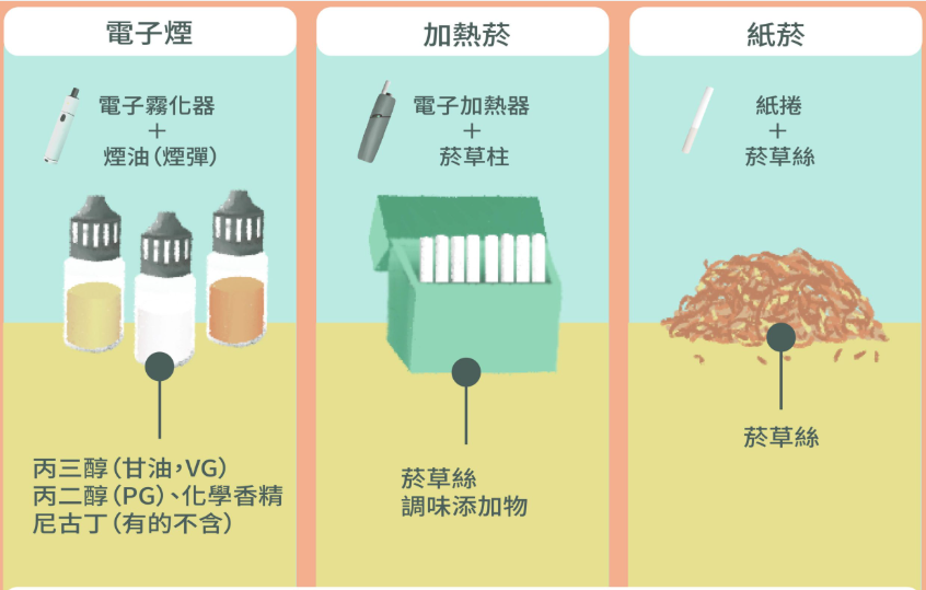 電子煙和加熱煙是完全不一樣的東西, EVALI 是指電子煙的傷害 電子煙在台灣比較常見, 最早出來, 把液體加熱蒸發來抽煙 加熱煙是把傳統香煙加熱來抽煙 https://kids.twreporter.org/article...ard-infographic ![]() |