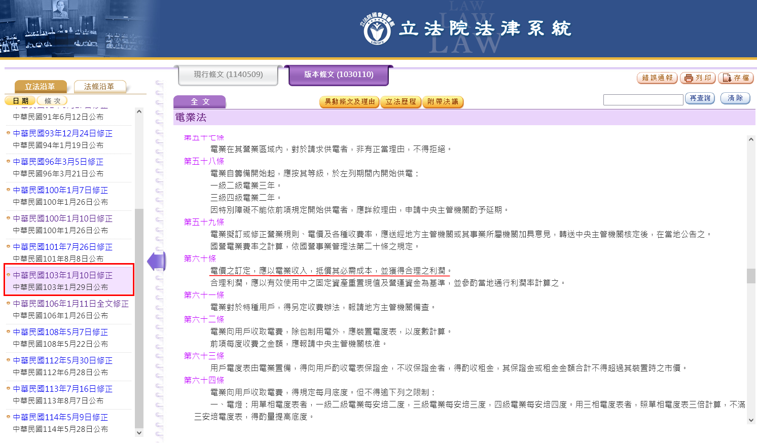 民國 103 年的電業法第六十條規定電價抵償必需成本要有合理之利潤。