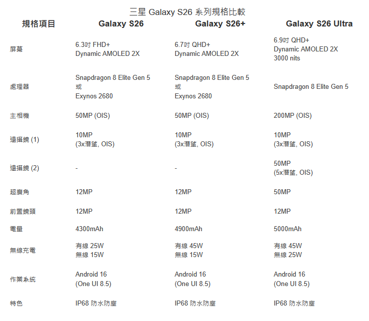 Galaxy S26 / S26+:歐洲版搭載三星自家 Exynos 2600,採十核心架構(1x C1-Ultra 3.9GHz + 3x C1-Prox 3.25GHz + 6x C1-Prox 2.75GHz)。
