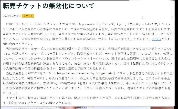 該不會發票上有打行政院的統編03722403? 另外卓向中職會長代買票一事,這恐怕也不是實情,中職有公關票幹嘛還要買? 蔡其昌承認幫卓榮泰代買球票,按照WBC的官方規定已經涉及違規! 大家在網路上搶 WBC 門票搶到崩潰,結果卓榮泰示範了什麼叫「高官的買票技術」: ❌ 不用排隊❌ 不用搶票❌ 甚至不用先付錢! 只要幕僚一通電話打給中職會長蔡其昌,可以這樣搞哦? 1.WBC本來就有「官方轉售服務」,不是這個渠道轉售就是違規。 規定明確註明「除官方轉售服務外,透過其他轉售方式進行的交易與轉讓不僅違反本大賽適用的「比賽觀賽契約約款」,更可能涉及違法。本公司除對轉售者採取「拒絕銷售門票」等處置外,亦將與警方合作嚴正處理。」 2.日本主辦方早就警告了:「禁止私下轉讓,違規門票直接作廢!」 卓榮泰帶頭藐視日本規定,搞私下匯款交易,並非走日本官方公開渠道購買,真的是丟臉。 3.中華職棒並非WBC官方售票、也不是官方轉售渠道,當時能夠買的平台只有「日本eplus、海外eplus、Lawson Ticket以及Ticket Pia」 請問卓榮泰匯款給中職代買是哪招? 主辦單位在公告裡說了一句重話「非法轉售剝奪了球迷公平觀賽的機會。」 這時在民進黨眼裡、智障閃兵廢物小跟班老嘴砲的特權就是個屁話 圖說文字翻譯 轉售票券無效化公告 2026年3月3日 — 票務 關於「2026 世界棒球經典賽™ 東京組別 presented by ЫュЧк」(以下簡稱「本大會」)的票券被非法轉售的事宜,主辦單位讀賣新聞社將對確認存在轉售的票券進行無效化處理。持有該票券者將無法入場。我們已向警察機關諮詢,對未經授權轉售網站的出品者進行警告,並持續展開調查。如對票券無效化有任何疑問,請在主旨標明「WBC票券」後進行詢問。 本公司已於本大會官方平台開設「公認轉售服務」。如因突發事件無法觀賽,持票人可將票券透過官方轉售服務上架出售,交易成功後即可合法轉讓票券。透過非官方轉售網站、網路拍賣、社群媒體等方式進行票券轉讓,不僅違反本大會比賽觀賽契約條款,也可能觸犯相關法律。對於轉售行為者,本公司將採取拒絕入場等措施,並與警方合作,嚴格處理。 此外,對於本公司主辦的2025年3月「MLB Tokyo Series presented by Guggenheim」票券在未經授權的轉售網站進行非法轉售的案件,東京都警察廳今日已依違反票券不正轉售禁止法之嫌疑對轉售行為者進行書類送檢。另有多起因非法轉售票券被警方逮捕,並收到罰金100萬日圓簡易判決(有罪)的案例。即便是購買到非法轉售票券的民眾,也需配合警方調查。有些案件中,轉讓票券的行為甚至伴隨以謊稱轉讓票券而詐取現金的詐騙事件發生。 票券的非法轉售及購買行為,剝奪了棒球迷公平、公正觀賽的機會。我們懇請各位務必停止此類行為。 ![]() |