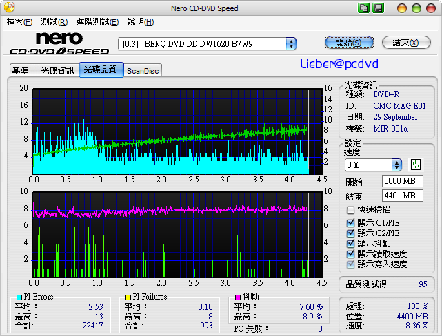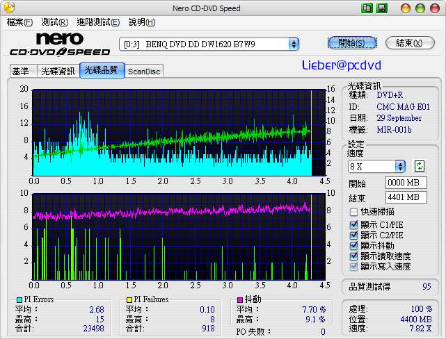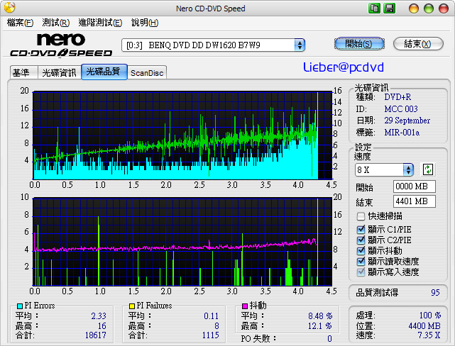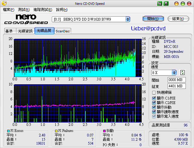 環境:Benq 1620 B7W9 4x寫入 / 8x測試 Nero 6.6.0.16 / CD-DVD Speed 4.07 來源檔案:MIR-001a/b (DVDiso) 圖一: ![]() 圖二: ![]() 圖三: ![]() 圖四: ![]()