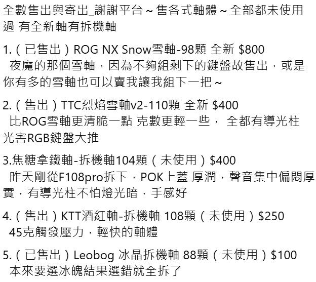 我的意思是 依你使用習慣,找不常用到的鍵 例如Insert,Scroll Lock之類的,拔軸互換 不用花錢,簡單方便 換無可換?FB社團找全新拆機軸 https://i.postimg.cc/90jb2ZJC/Z-1.jpg 100元體驗新軸,當然手感適應另說 |