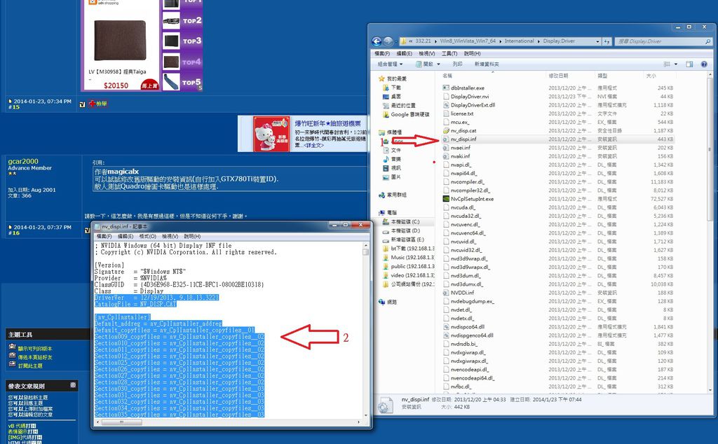 ![]() 1、先進去新版的驅動程式資料夾裡面,找到International,再點進去找到Display.Driver,再點進去找到nv_dispi.inf 2、打開nv_dispi.inf之後,開始把我圈起來的以下"所有",所有的意思是圈到最底部,圈好之後,選複製。 3、進去舊版的驅動,一樣找到nv_dispi.inf,把剛剛步驟2的順序再做一次,然後把剛剛複製的貼上,儲存。 4、開始用以前的版本安裝驅動。 開心使用~ 結束。 |