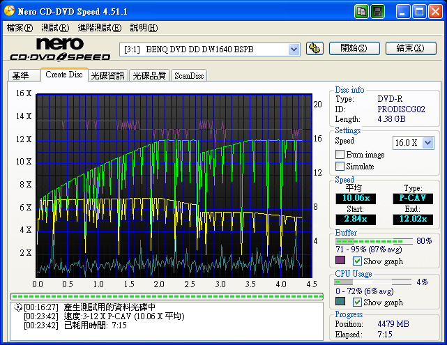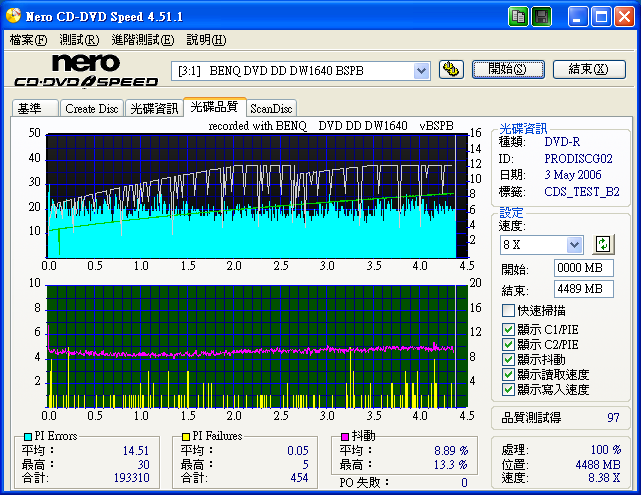 爽度不高的PAHA18 HP 8X+R MCC003 多工 開防毒 & BT XP SP2 1640 BSPB 官方韌體 WOPC開 SOLID BURN關 8X NERO DVD SPEED 4.51 燒 , 8X測 ![]()