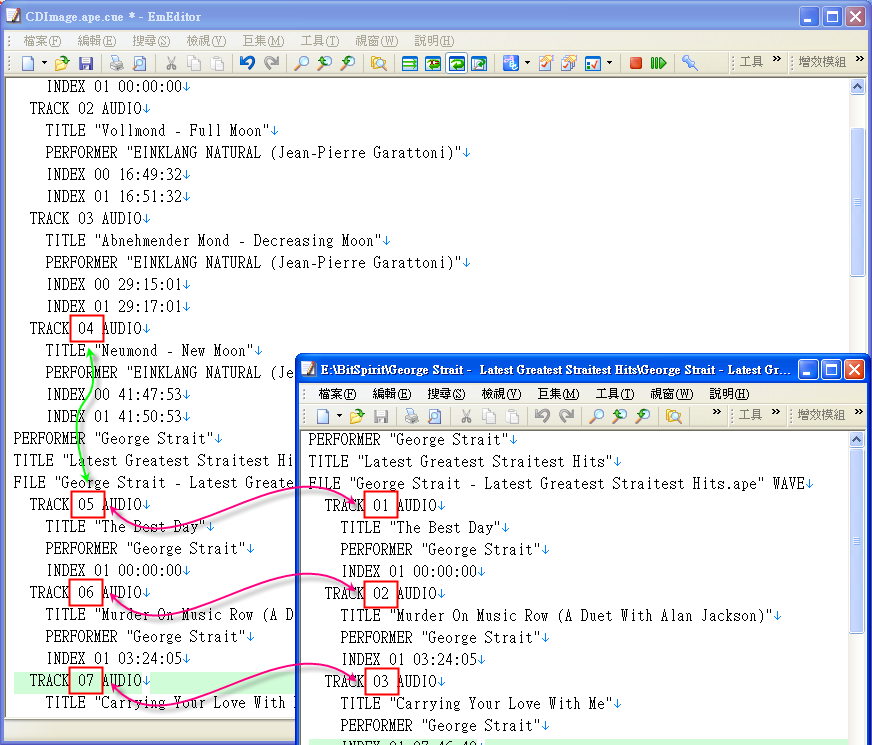 第一種我試不行,如果拖進第二個CUE會取消第一個CUE。 至於圖片的方法應該是第二個吧?只要更改TRACK就行了嗎?
