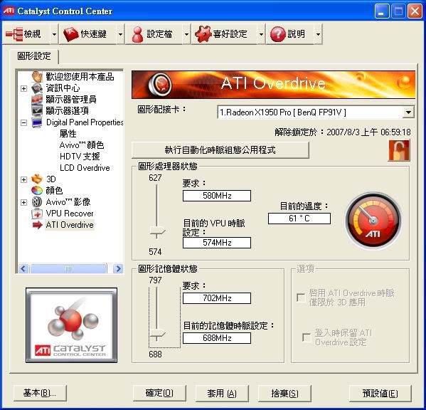 如果微星官網說有但產品卻沒有的話 我想會被告翻 所以我會選擇相信微星的說法 至於ATI Overdrive 我不會貼圖,但確實在我的CCC裡面有這個選項 其他有購買此款RX1950PRO的網兄可以出來見證一下 |