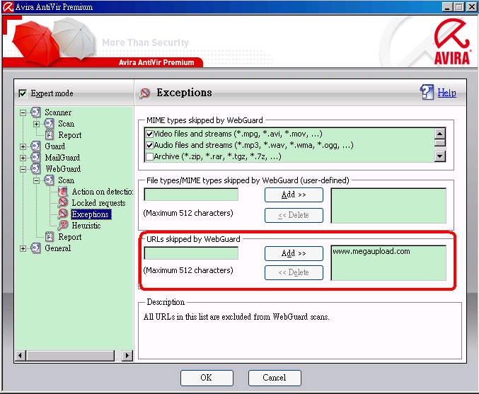 是不是小紅傘在搞鬼.... 我前陣子 有幾個朋友包括我... 都無法連上 MU 的網站 後來發現都是小紅傘搞的鬼... ![]() 先試看看 是不是小紅傘擋掉.... 先用瀏覽器開MU網頁.... 如果有出現以下的畫面... 表示是被小紅傘的 Webguard 擋掉... ![]() 如果是以上的情形的話... 請在小紅傘的 Configuration -> Expert Mode 要打勾 -> Webguard -> Scan -> Exceptions 中的 Urls skipped by Webguard 打上 MU的網址 -> 按Add>> 再按 OK保存設定 如下圖... 就可以解決 這類的情形... ![]()