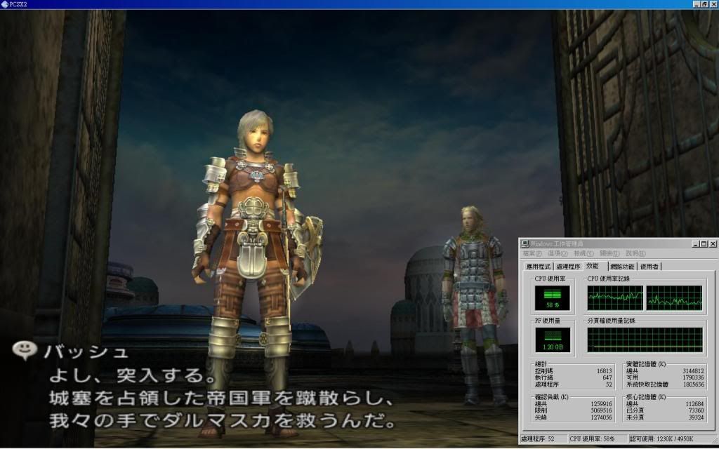 FF XII 最近沒測試到 不過必須要用手把才能遊玩 一開始過場動畫看完之後 控制腳色必須用PS2手把的香菇頭轉 半年前測試是用 E8400 跟 4850 測試 順利遊玩的4個小時以上,也很順暢 最主要要找到對的設定 大多遊戲可順利遊玩了 新版PS2模擬器開始支援 加速 預計 晚上,PO測試圖給你看~