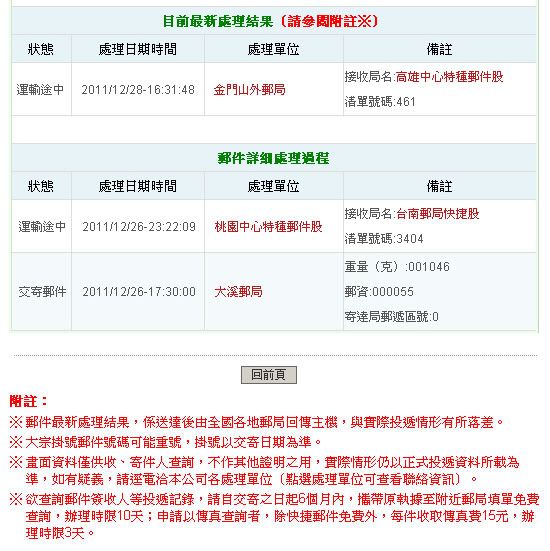 也是有可能,不過從處理日期中看不太出來,因為從桃園到金門差了兩天 這還是我第一次遇到這樣的事 就郵局規定來看,只有限時跟快捷郵件才有延誤退費,但也只是退郵資而已~ http://www.post.gov.tw/post/interne...ex.jsp?ID=12104 |