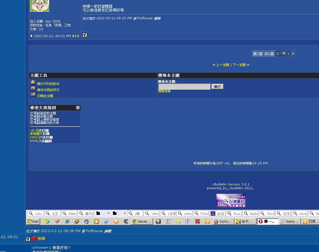 但八版以後上了FLASH 就會變龜 只好把外掛設為停用 必要時再啟用 最後懶的麻煩 再給opera一次機會(順便看那兩個BUG解了沒) 結果號稱精品級短小精幹的OPERA這次很給面子 目前看來只剩下那個hyperlink偶爾會停止的問題而已了 FLASH順暢太多了 CHROME是吃記憶體怪獸,且UI簡化到有點過頭了, 這玩意跟ANDROID一樣,很難想像這是我們認為網路大神的GOOGLE的產品. 此文章於 2012-03-12 10:07 PM 被 tsushi 編輯. |