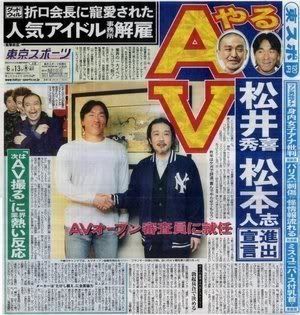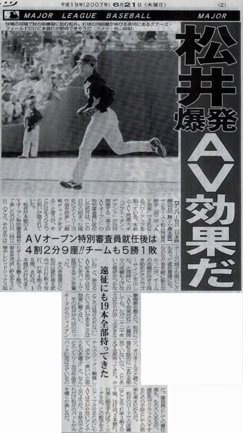 美國職棒9月號 裡面P103頁有個不能說的秘密 就是松井秀喜很喜歡看***還擔任AV OPEN的評審 主辦單位特別將影片寄到人在美國打球的酷斯拉 在審查期間 松井有4成29的打擊率