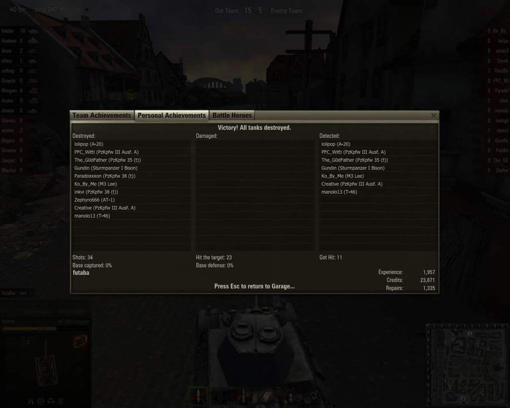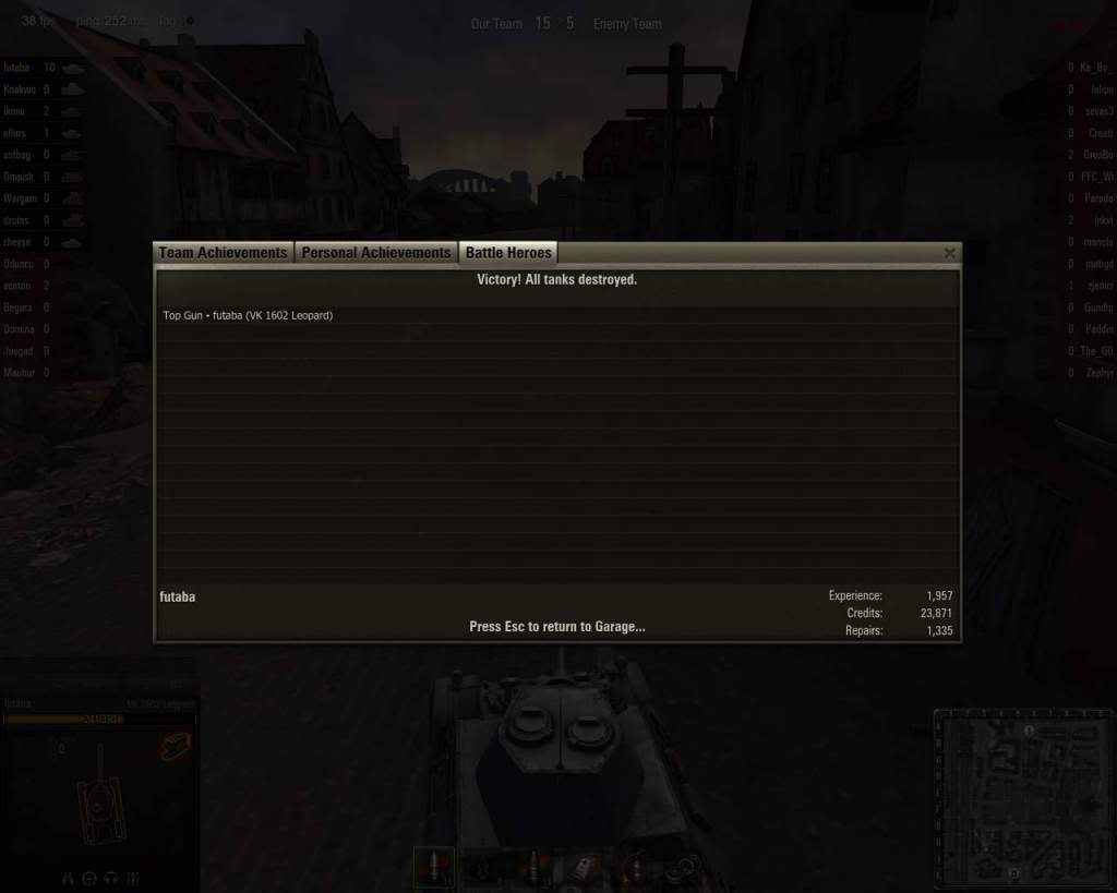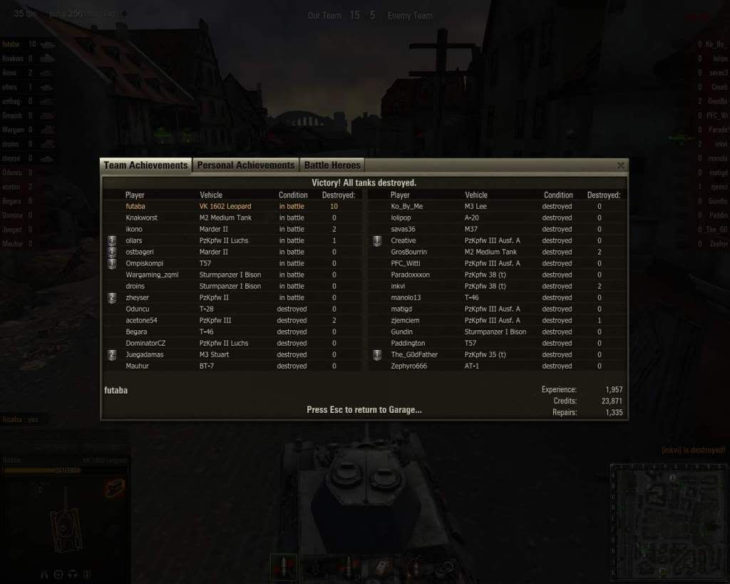 還是要看心態吧~ 前天有場lakeville去把VK4502卡在基地附近山邊, 反正我知道死定了, 我只是要卡到他很難出來,讓自走砲去揍, 順便保護自走砲, 結果我方S-51一砲就把他揍剩個位數, 我直接噴零件. 然後應該是阿貓已經開虎大王去搶旗, 等到VK4502脫困, S-51 miss, 也噴零件, 但是已經贏了. S-51跟我道歉, 我直接告訴他"nvm, you have done well!" 把個人死生置於度外, 隊友會欣賞你!