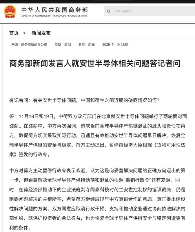 到了傍晚又看到粉紅大V出來罵荷蘭在玩文字游戲,法院沒有撤銷裁決。 安世風波!聞泰科技再發聲 要求恢復股東完整權利 聞泰科技週四(20 日)晚間通過官方微信公眾號發布關於荷蘭經濟部暫停行政令的聲明: 「行政令雖被宣布暫停, 但荷蘭阿姆斯特丹上訴法院企業法庭作出的緊急措施並未取消, 中方股東和人員合法權益所受到的限制和侵害仍在持續進行中。 荷蘭經濟部僅宣布暫停行政令, 迴避了在其推動下的企業法庭剝奪聞泰科技對安世控制權的錯誤裁決, 未能觸及問題解決的關鍵所在。」 聞泰科技要求,荷蘭經濟部不僅應當永久性撤銷其基於《貨物可用性法案》發布的行政令, 撤回其對企業法庭的參與及支持, 還應當確保中方股東的合法控制權及中方人員的合法權利得到恢復, 將安世恢復至 2025 年 9 月 29 日之前的狀態。