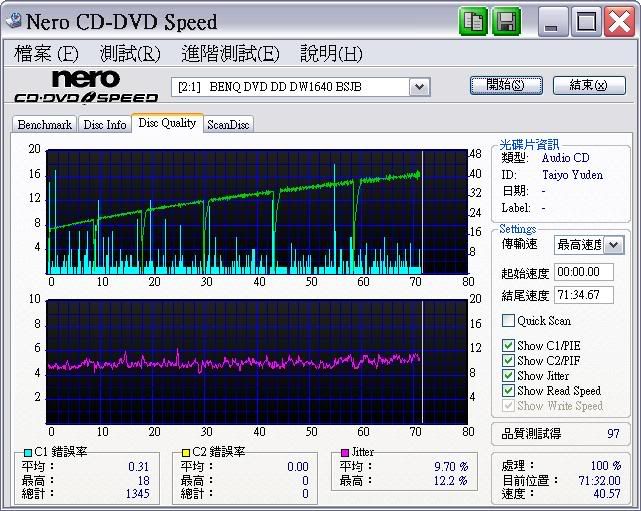 本人資料用片家樂福的no.1片157元時買的堪用沒發生剝落或資料遺失的事過 測試如下 ![]() 音樂片v-star 順發 552購入 測試起來不輸我燒的太誘RV 或yamaha 16x by ty 當然缺點是版面很醜,但我的換片箱只吃太誘與SONY水藍與原版(老機器極挑片) V-STAR是很經濟的考量,測試如下 ![]() 以上都是1640 BSJB燒的 資料只要讀的出來不遺失,我一向就OK的 MELODY與萊德紫色版面都不推薦,一個是剝落,一個是沒剝落但資料COPY不出