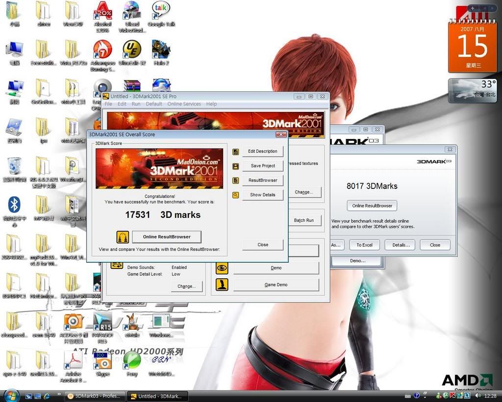 CPU:AMD Turion 64 ML-40 MB:ASUS K8V-VM RAM:金士頓DDR400 CL3 1T VGA:HD2600 Pro GDDR3 256MB OS:Vista U 32bit OverDrive介面有小改 ![]() 3D Mark 01,03 ![]() 另外個人對Vista版驅動的整合安裝覺得不錯,只是多國語言驅動好肥(107MB)有整合驅動+CCC+AVIVO等等