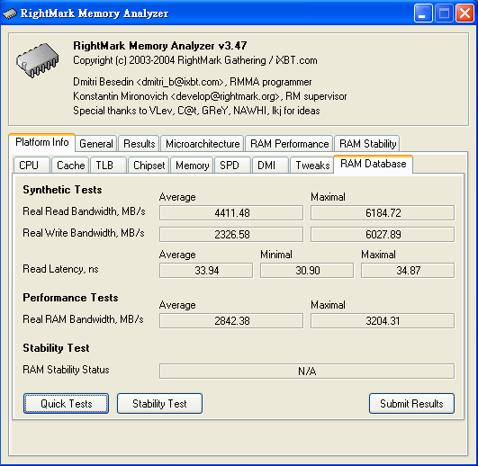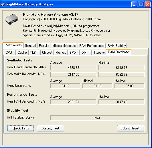 之前是用Memtest86+來看,可以快速調參數而不必進Windows,現在我在Windows中用Rightmark Memory Analyzer來測試CL2.0-2-2-5和CL2.0-2-2-8的不同,請看