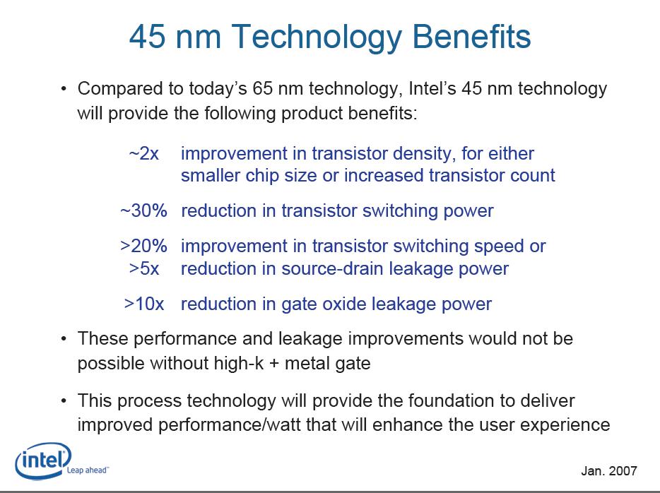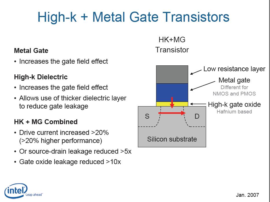 high-k材料來突破 什麼是high-k物質? 二氧化矽的缺點在於:持續變薄使其控制漏電流變得困難,而high-k正是一種較厚而在未來幾年極有可能取代現今二氧化矽的技術。 High-k意指高介電常數,是用以衡量一種材料能儲存多少電荷。不同材料會有不同儲存電荷的能力,好比海綿能夠吸收很多水分,木頭吸收得少了些,而玻璃則完全無法吸收。空氣是此一常數的參考點,其k值為1。High-k材料,如HfO2 ZrO2及TiO2,天生具有超過二氧化矽3.9的介電常數或k值。介電常數也直接與電晶體的效能有直接關係。k值越高,電晶體之電容值也越高,使得電晶體能正確的切換於”開”與”關”狀態,同時在關時具有低電流,而在開時具有高電流。 資料來源 http://www.challentech.com.tw/produ...id=43&classid=2 應該intel是又遇到時脈無法順利提升的瓶頸,改用High-k材料來突破吧