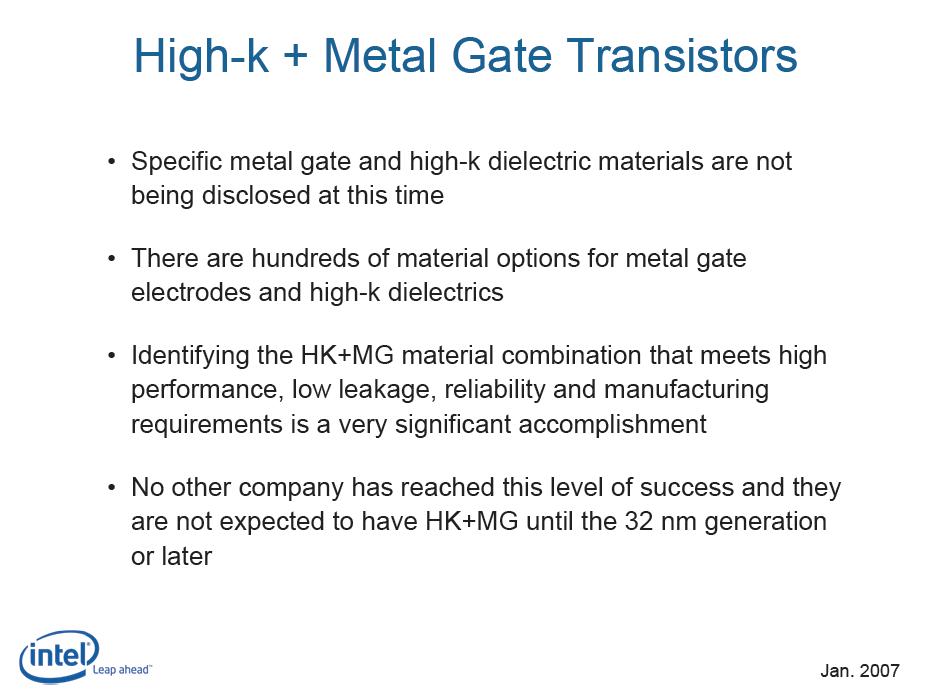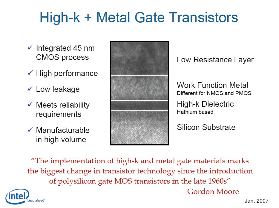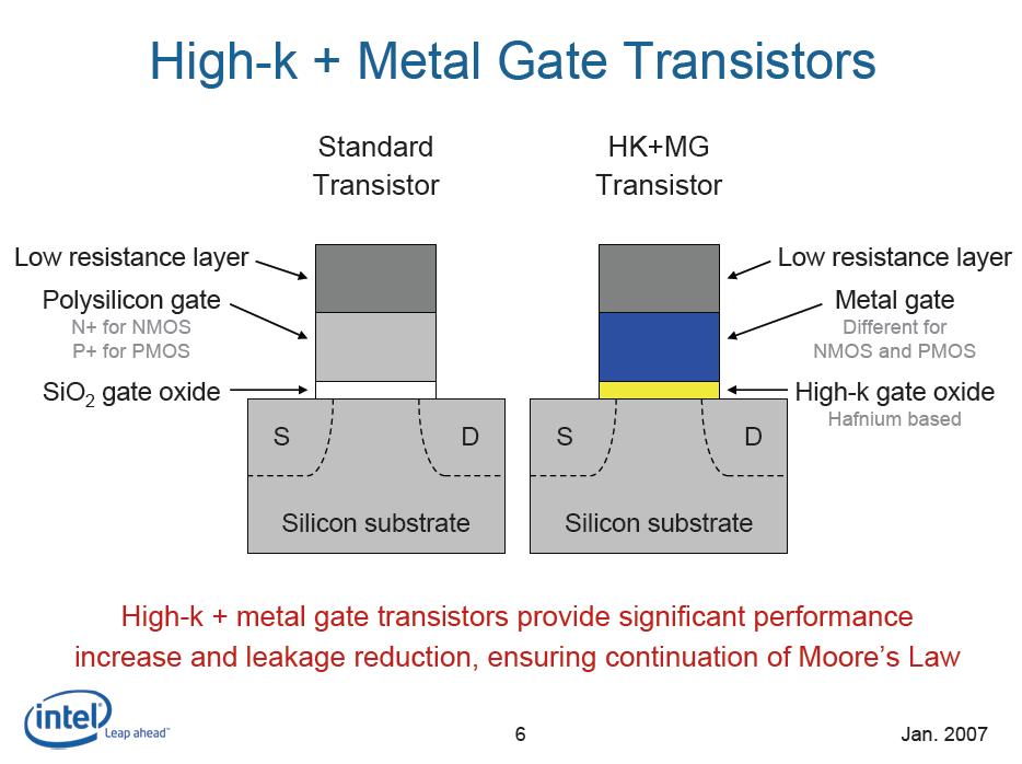 翻譯這篇的吧 http://www.intel.com/technology/sil..._technology.htm High K主要是解電晶體漏電流,矽晶圓上長的二氧化矽在過去10幾(>20?)年來一直是品質最好、最方便成長(直接氧化矽)的介電質材料;High K不是單單換一個材料而已(雖然有很多種候選材料,但是幾乎只有HfO2是有機會用的),換來的一大堆問題是十幾年來許多paper討論的重點,總結就是intel那個網址裡面寫的Fermi level pinning(使電晶體開啟電壓難以調動)和remote phonon scattering(使電晶體效能下降);Metal gate可以解決上面兩個問題,但是搭配High K的metal gate也是很多的討論重點(就是問題很多的意思),的網址裡寫著「The specific metals are a trade secret」實在是很吊人胃口,因為這比High K用什麼材質來得更吸引人注意。 High K不是intel的專利,也不是只有intel在做,但是在我所看到的學界是相當悲觀的(甚至對是不是真的可以量產都存疑),業界好像也是硬著頭皮try,但是intel的處理器已經可以run了;今天上班開始聽到同事哀嚎跟intel的距離拉更大了 ![]() -- Intel今年一篇VLSI都沒有,想想看是什麼原因。