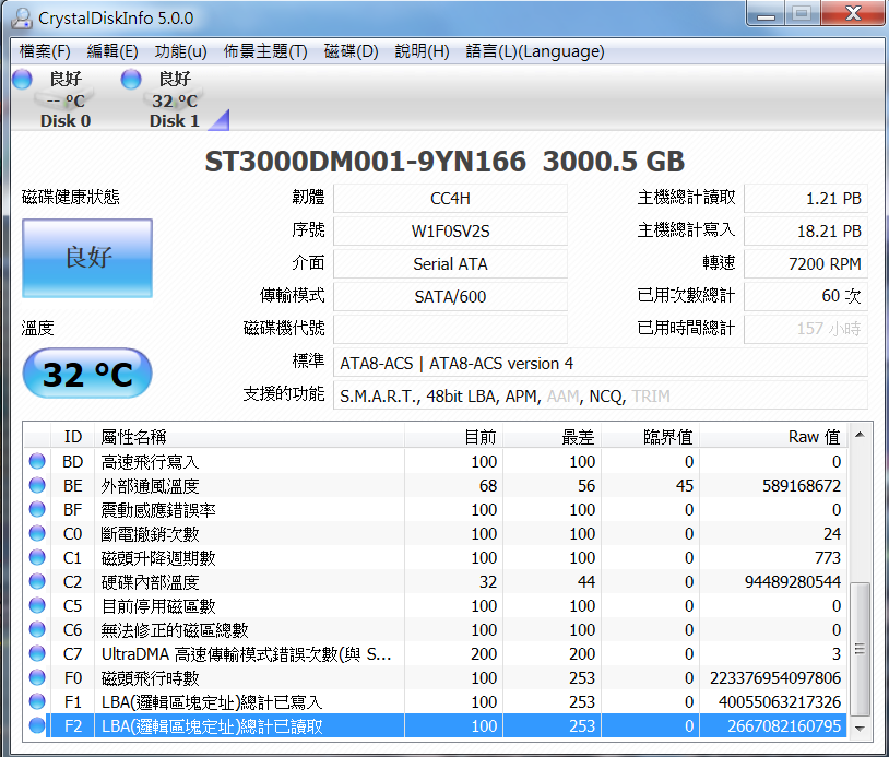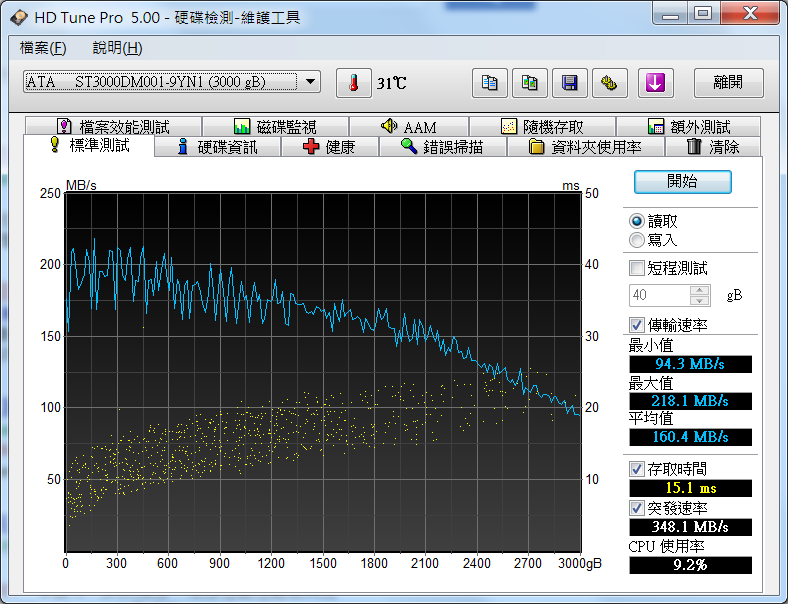 我的01 07 F1 F2 也是差不多慘 看來SMART都不SMART了 感謝測試 順便提供一下我的3T同一顆 hdtune 讀取速度最小80 最大220 平均161 |
